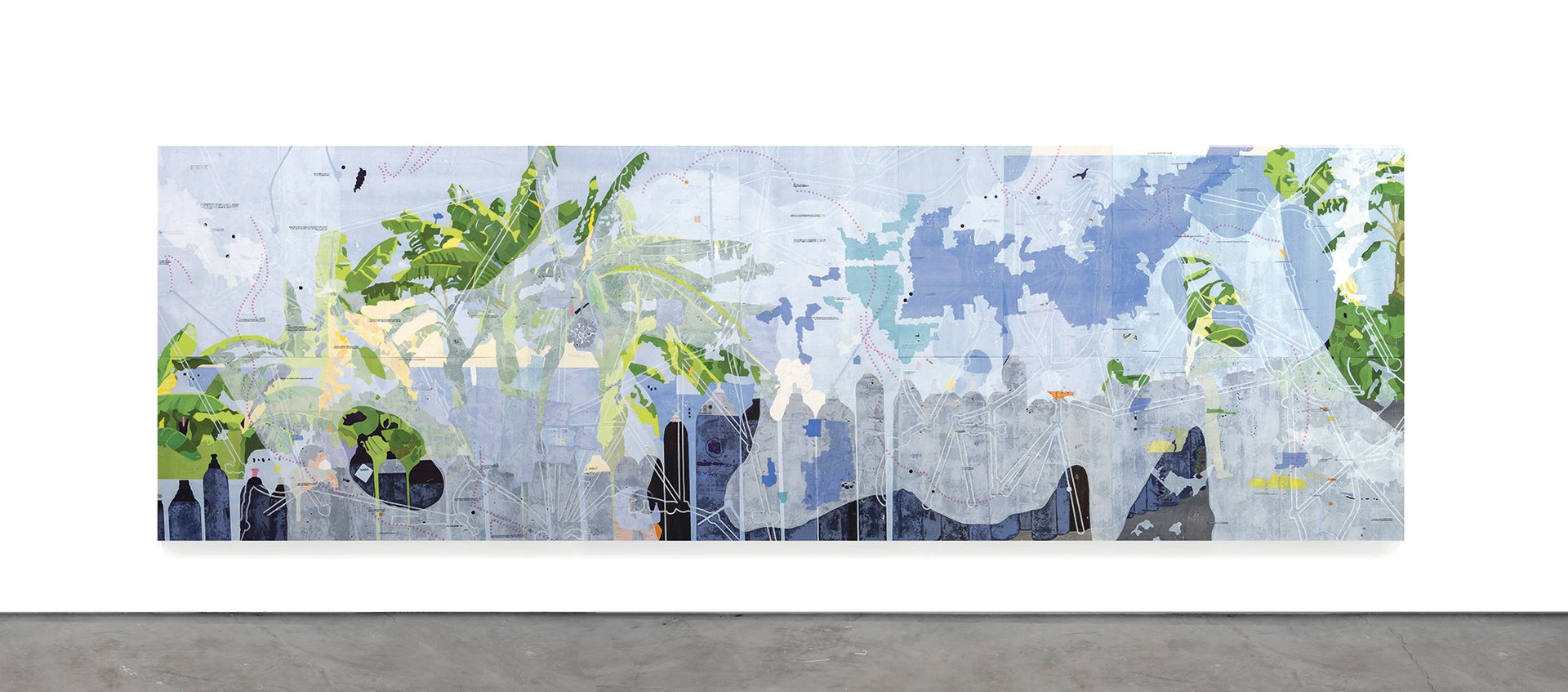 A row of oxygen tanks depicted in Mexico-based Hugo McCloud’s painting, priced at $450,000 in Unlimited, is a grim reminder of shortages in countries such as India at the height of the pandemic, which contributed to the deaths of thousands. The tanks are set against a backdrop of migration paths, alluding to the unfinished border wall between Mexico and the US. The work “is directly responding to the pandemic and other current issues happening simultaneously such as migration; the oxygen tanks are relating to the shortages in many impoverished areas,” McCloud says.