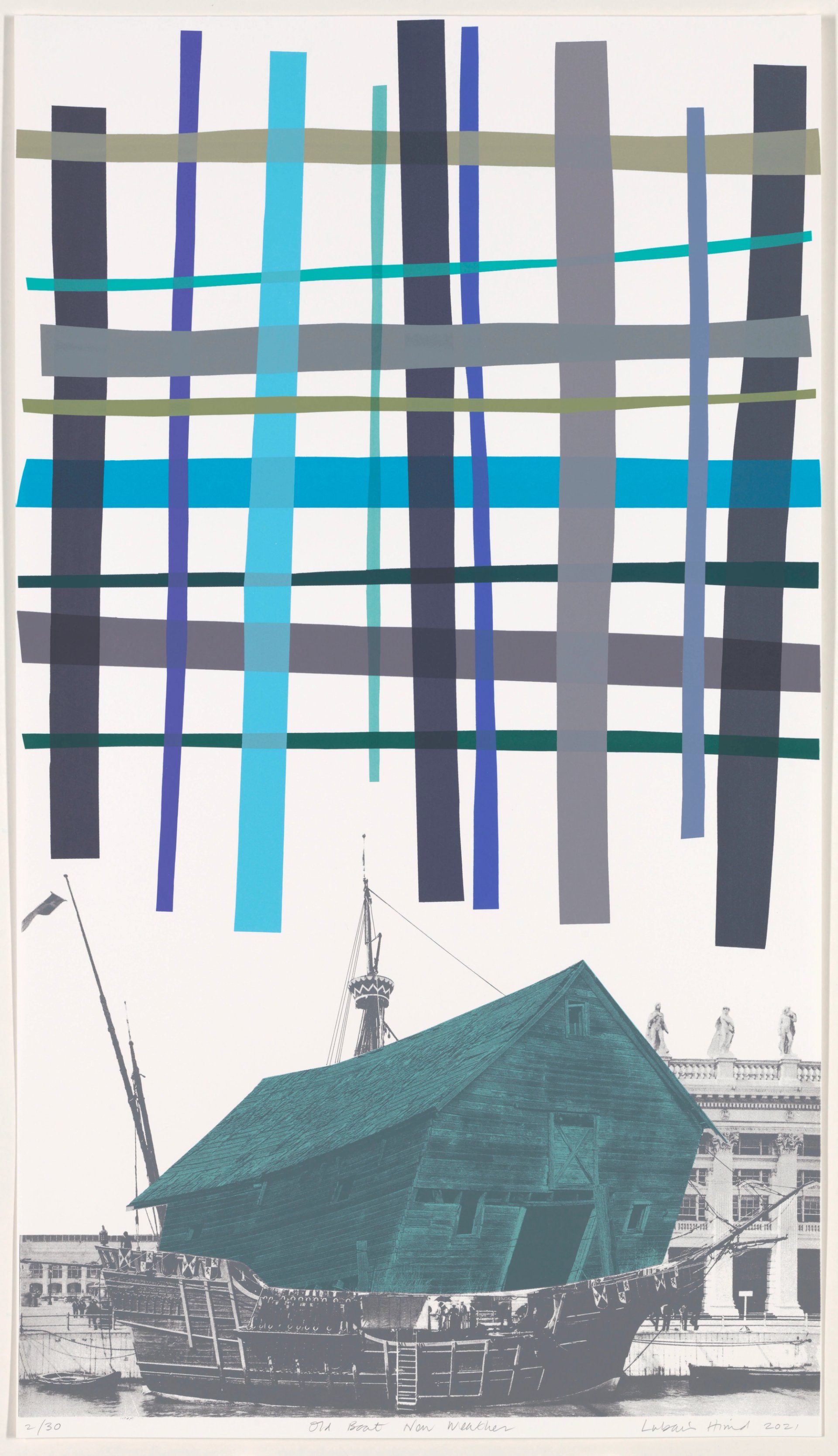 Old Boat, New Weather, the commission for the Government Art Collection, is a screenprint depicting a shack being carried on a sailing ship, with a European building on the harbourside. The “sky”, pushing down on the vessel, is a grid of blue and grey lines.