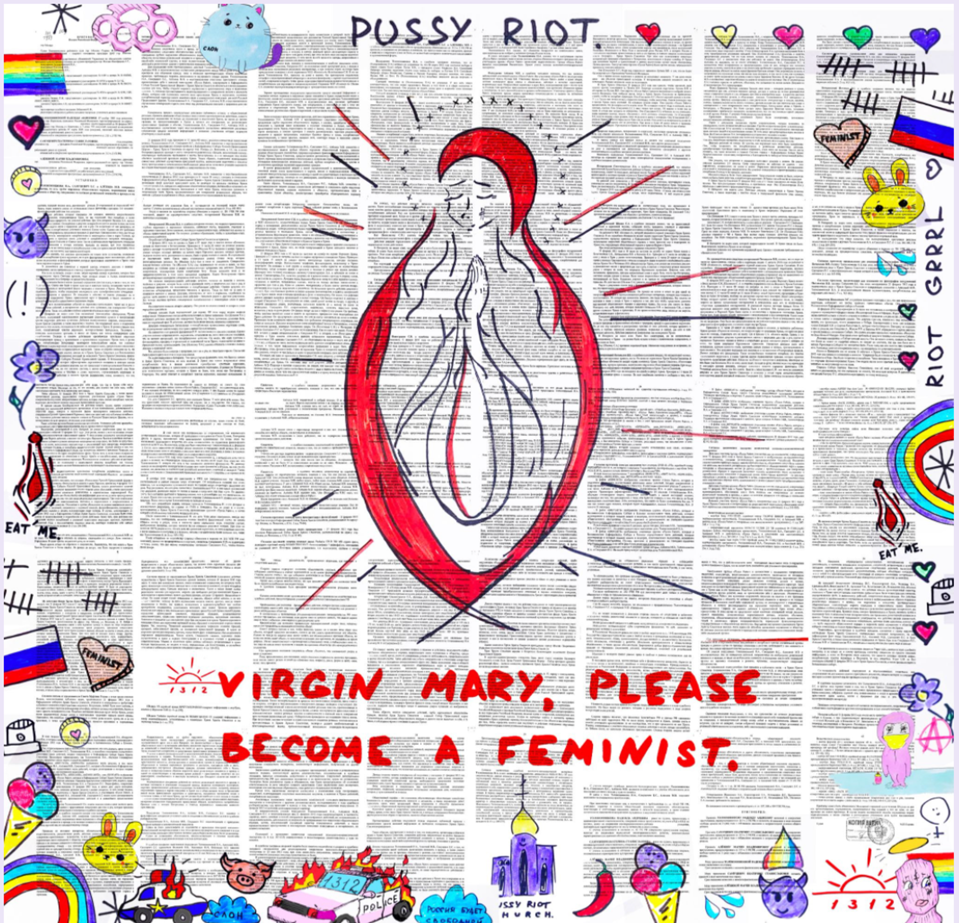 For the NFT, titled Virgin Mary, Please Become A Feminist (a line taken from Punk Prayer), Tolokonnikova has drawn the Virgin Mary in the shape of a vagina over a digital copy of the prison sentencing document. Around the edges are child-like renderings of hearts, flowers and ice-creams mixed with images of burning police cars, anarchist symbols and the rainbow flag. The NFT is being released on SuperRare today with an initial reserve of 13.12 ETH (around $38,000), accompanied by a collection of 222 unique hand-drawn pieces minted for 0.1312 ETH each (around $380). All proceeds will go towards supporting victims of domestic violence in Russia, political prisoners who are currently incarcerated and Pussy Riot’s future art and activism projects.