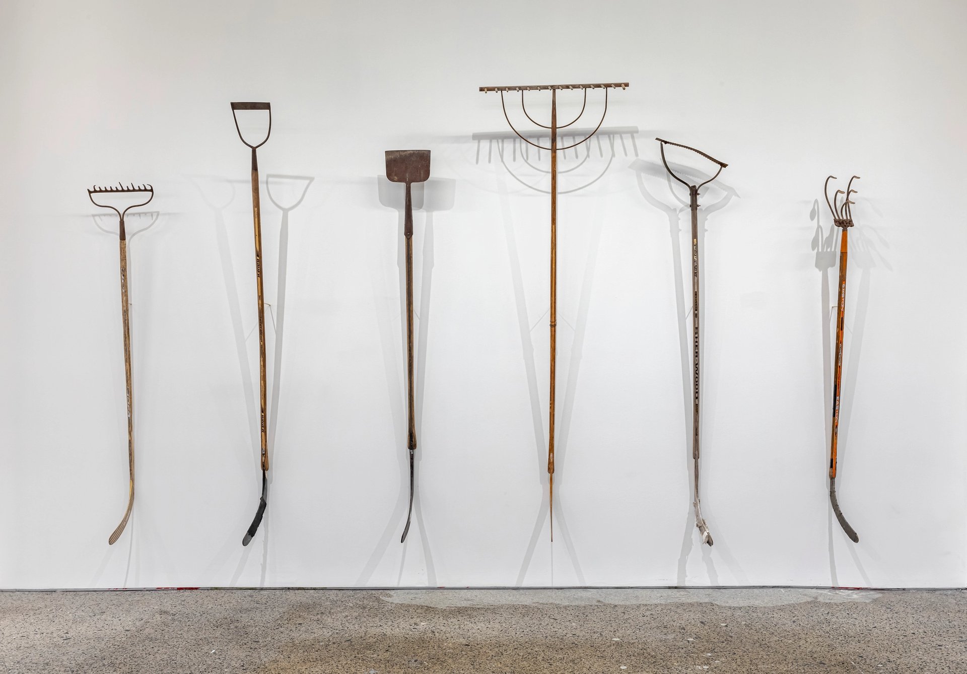 The works incorporate all manners of materials, some of which are found near the museum. There’s even a smattering of battered hockey sticks fused with antique farm equipment—a tribute to Black Loyalists who fled the United States for Canada between 1783-85. Also on view are ceramic vases arranged under a slowly-dripping irrigation system, found furniture and a wall-sized map on washi paper.