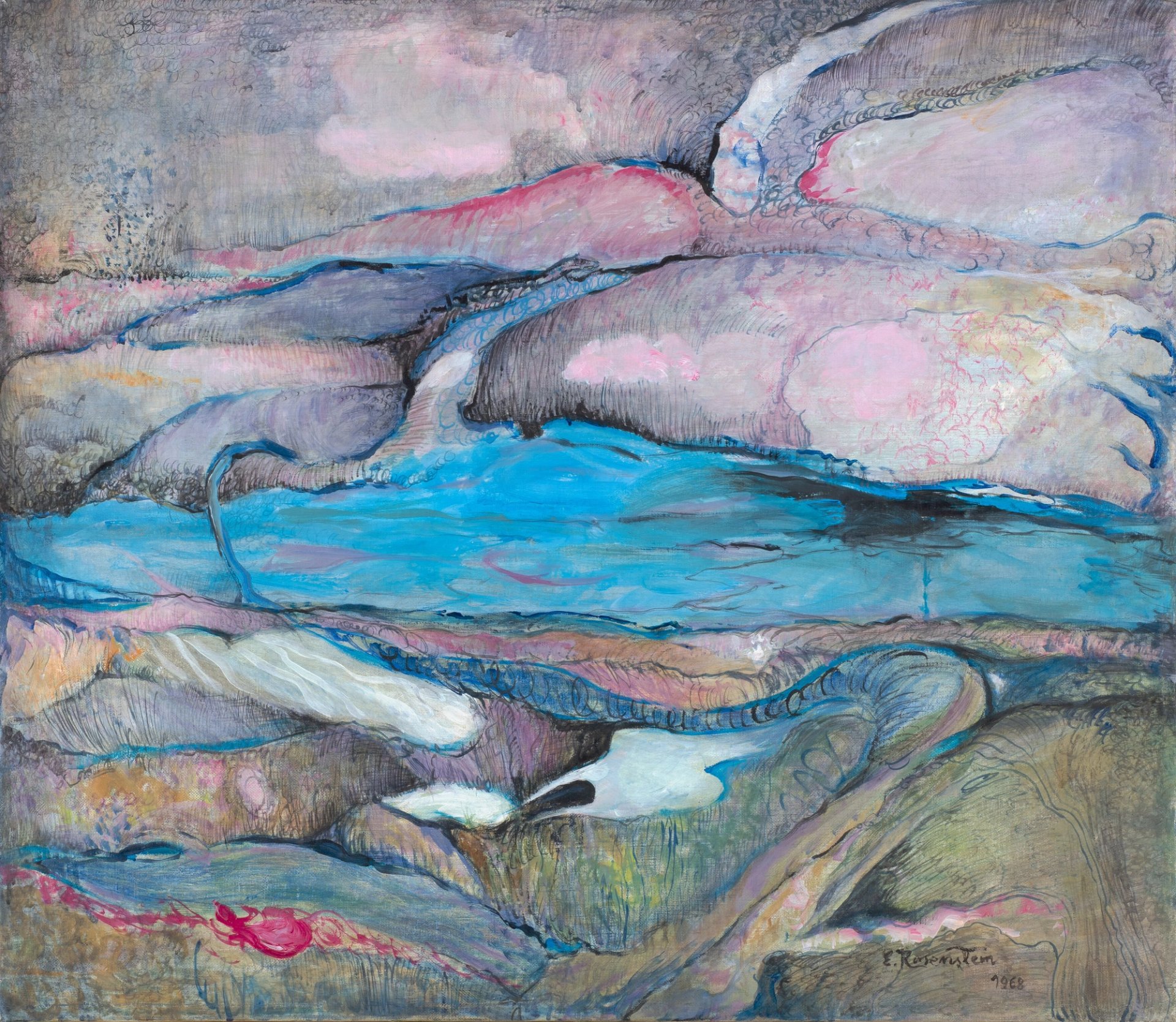 The late Surrealist artist Erna Rosenstein (1913-2004) was a pivotal figure of the Polish avant-garde but remains little-known outside of Eastern Europe. The first monographic exhibition devoted to her work in the US presents more than 40 paintings, drawings, sculptures and writings that oscillate between magic realism and more pragmatic themes, from ethereal landscapes to poignant works that reflect on the Holocaust, during which she witnessed the murder of her own parents by the German army. Although none of Rosenstein’s pre-war works survive, the traumas she endured in that era would haunt her work for a lifetime. It is referenced in several evocative pieces in the exhibition, including Świt (Portret Ojca) (Dawn) (Portrait of the Artist's Father) (1979), which shows her father’s head hauntingly decapitated from his body. Even vibrant, sinuous paintings like Poświata (Afterglow) (1968) seem to imply something sinister lurking beneath a fragile surface.