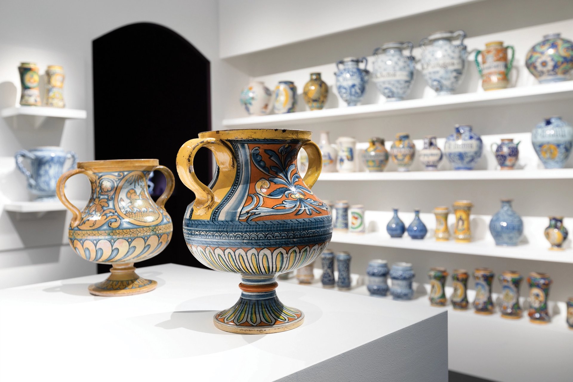 “The 100 or so Renaissance pharmacy jars on this stand are laid out in such a way as to invoke a Renaissance pharmacy, but at the same time each object has its own integrity. These vivid decorated jars provided customers with joy and confidence as they went about their shopping, looking for health-giving elixirs and potions, or treats. They give a dynamic sense of lives lived—just by sitting on a shelf. Some of the earliest here are 15th-century, most are 16th-century, and a few are 17th-century, Italian and French. We are presented with their exuberant frontal view, then when taken down to the counter their function would be revealed. Unlike domestic objects they represent the seduction of retail.”