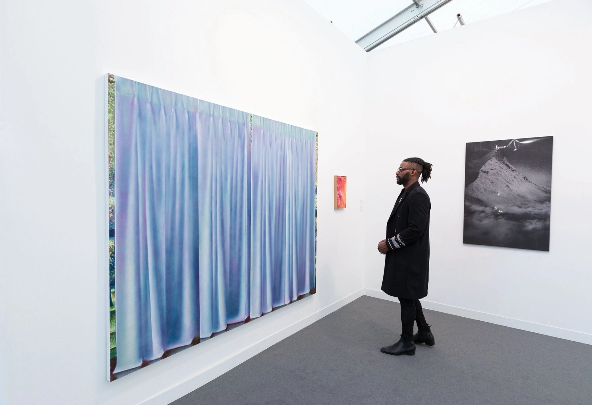 Several of Manchester-based Louise Giovanelli’s (also born 1993) luminous paintings of opulent drapery are in Mixing It Up, and Grimm gallery is exhibiting two such works at Frieze London. Both have sold—Plaza (2021, asking price $40,000) is headed for “a major British institution, via a client donation”, according to Jorg Grimm, the gallery’s owner, while the other, Auto-da-fé (2021, $8,500), is a promised gift to a New York museum.