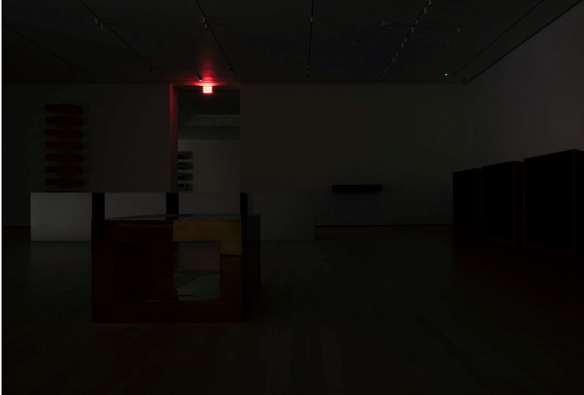 At first glance, Louise Lawler's new series of expansive, large-scale photographs printed on aluminium plates appear to be of shadowy boxes in darkened storage rooms—non-things in non-places. Those with a finely tuned knowledge of art history (or copies of the exhibition press release) can soon decipher these shapes as the outlines of works by the minimalist master Donald Judd that were shown at Judd, his Museum of Modern Art retrospective which closed last year. Lawler has spent much of her career appropriating and imitating works by other artists under the guise of "institutional critique", and by photographing Judd's works in the dark she gives them a totally new life, portraying them as they are rarely seen, except perhaps by night security guards. The result is a show that seems to both support Judd's wish to rid his work of the "relational qualities" possessed by traditional art forms such as painting and sculpture, while also denying these works much of the materiality and form that Judd was so keen to foreground. Most interestingly, by plunging Judd into the dark, Lawler's metal photographs take on their own complex materiality, gaining a dense, sculptural quality that would be lost if the lights were turned on.