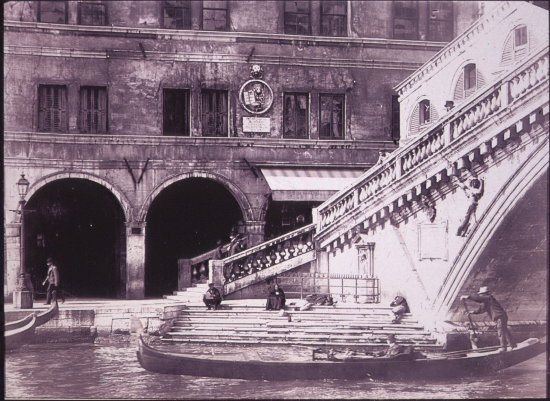 In this picture of the Rialto in Venice from around 1900, six steps are clear of the water. Photo: Osvaldo Böhm.