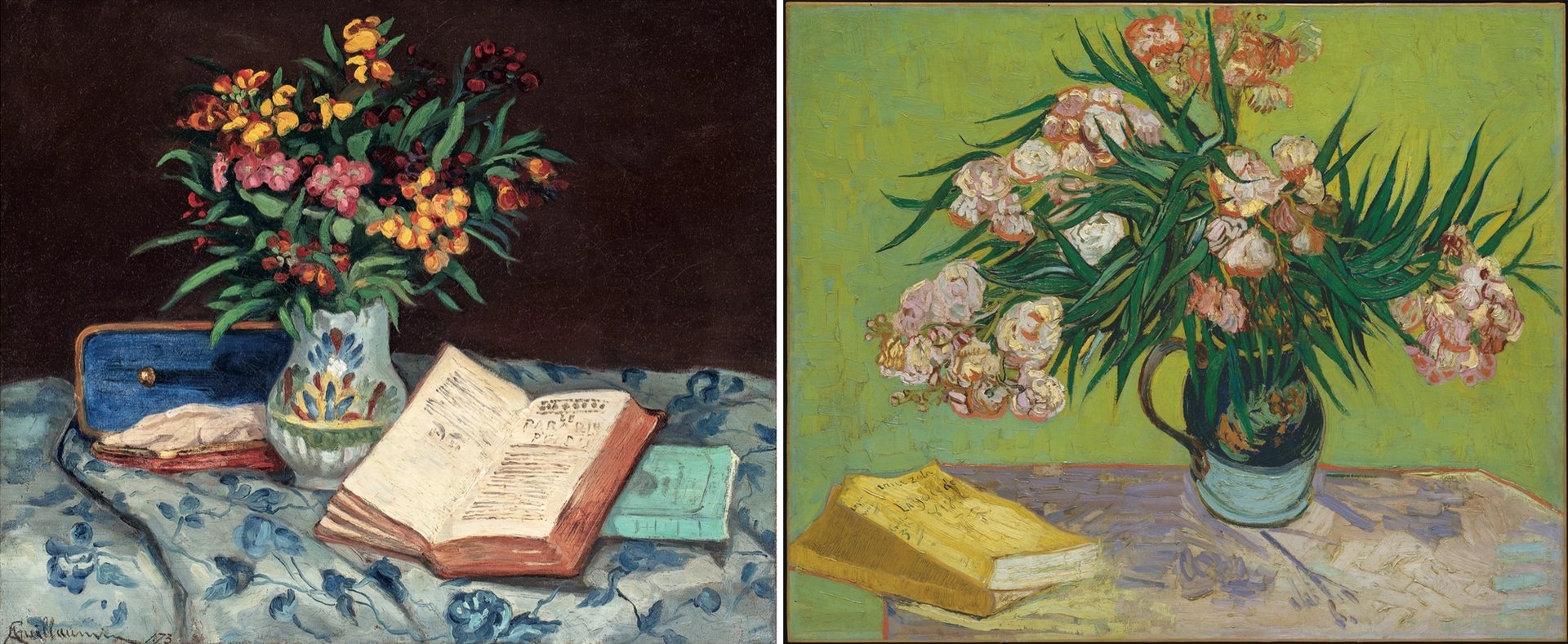 Armand Guillaumin’s Still-life with a Blue Box (around 1873) and Van Gogh’s Oleanders (August 1888) Guillaumin: Gregory White Smith and Steven Naifeh (photo: Glenn Castellano); Van Gogh: Metropolitan Museum of Art, New York