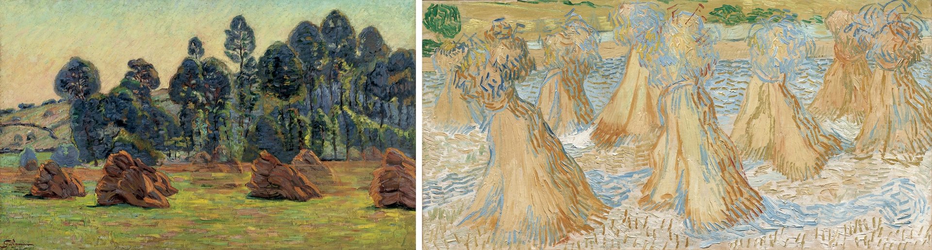 Armand Guillaumin’s Breuillet (August 1890) and Van Gogh’s Sheaves of Wheat (July 1890) Guillaumin: Gregory White Smith and Steven Naifeh (photo: Glenn Castellano); Van Gogh: Dallas Museum of Art (Wendy and Emery Reves Collection)