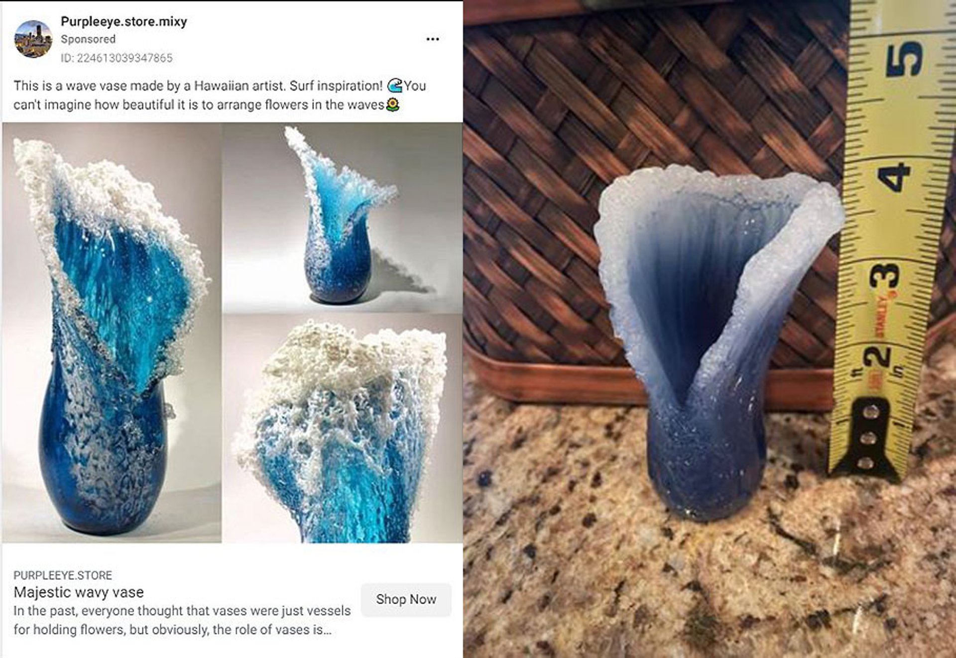Buyers clicking on a fake ad showing images of a breaking wave glass vase by Marsha Blaker and Paul DeSomma received a cheap knockoff instead.