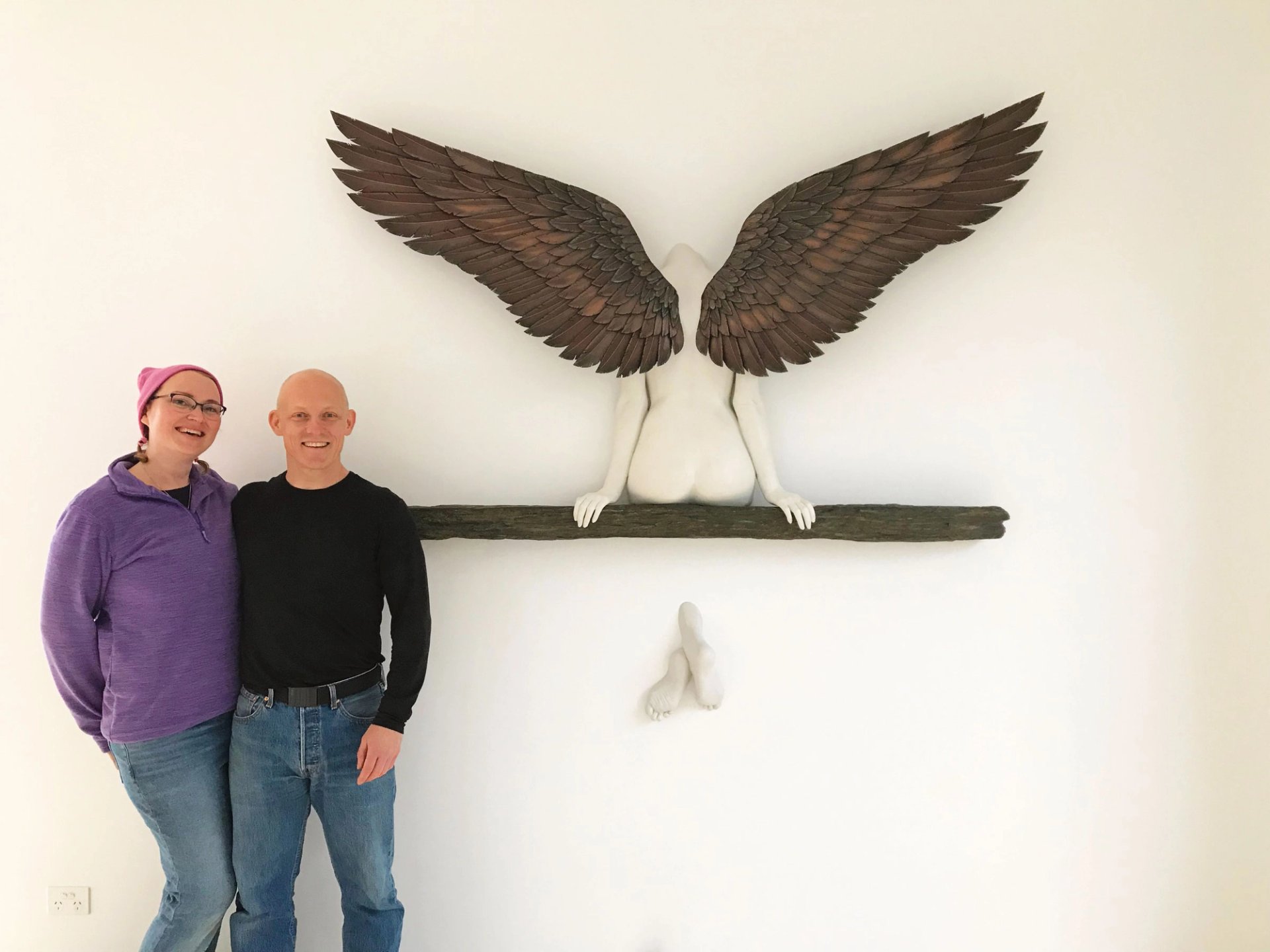 The artists André Masters & CJ Munn stand with their work Icarus had a Sister. Courtesy of Masters & Munn.