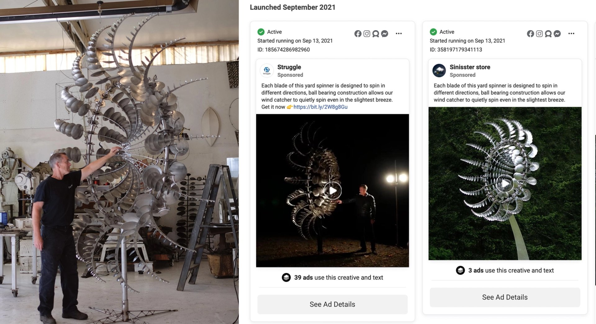 You might have seen the adverts on your Facebook feed: an eye-catching sculpture made by an independent artist, offered in a run of repetitive sponsored ads, for a cut-rate price. But if you actually clicked on the link and bought the piece, you would likely either receive nothing or a cheap knockoff with only a passing resemblance to the work pictured in the post.