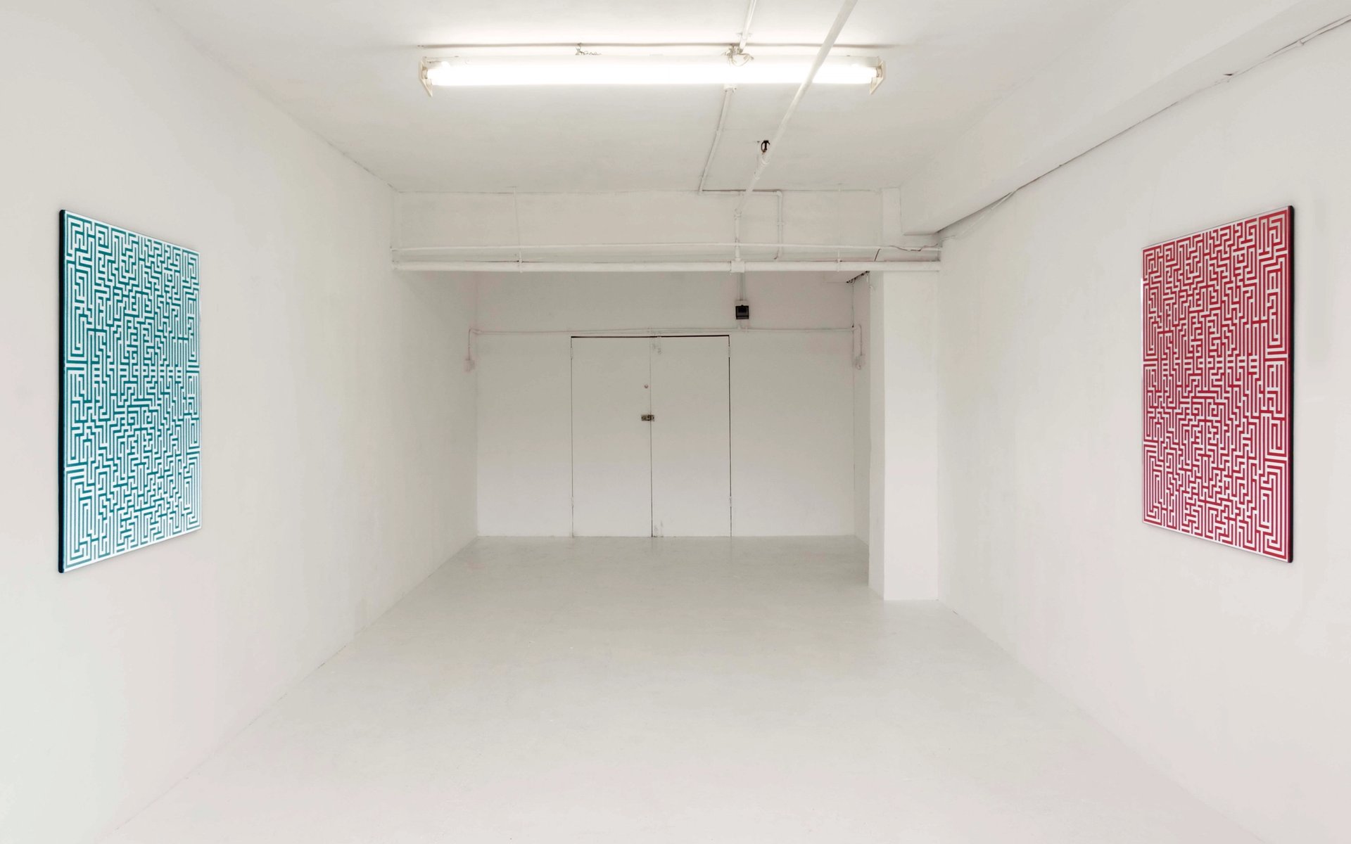 Two mirrors hang on opposite walls of an otherwise empty white room facing out onto Ridley Road Market in Dalston. Stencilled onto each are thick straight lines that are joined at perpendicular angles so as to form a maze map. At their most formal, George Henry Longly's gogo mirrors (2021) are an invitation for the viewer to consider, and toy with, visual depth. When stood in front of the mirrors the viewer sees from both the front and back their reflected figures, each of which is largely obscured by the maze. The effect draws us in and pushes us away: a direct confrontation with the alienating impulse of minimalist art. This dynamic is further referenced by the works' respective colours: one is executed in red and the other in dark cyan, chromatically opposite colours used in stereoscopic devices to produce an illusory sense of a 3D image.