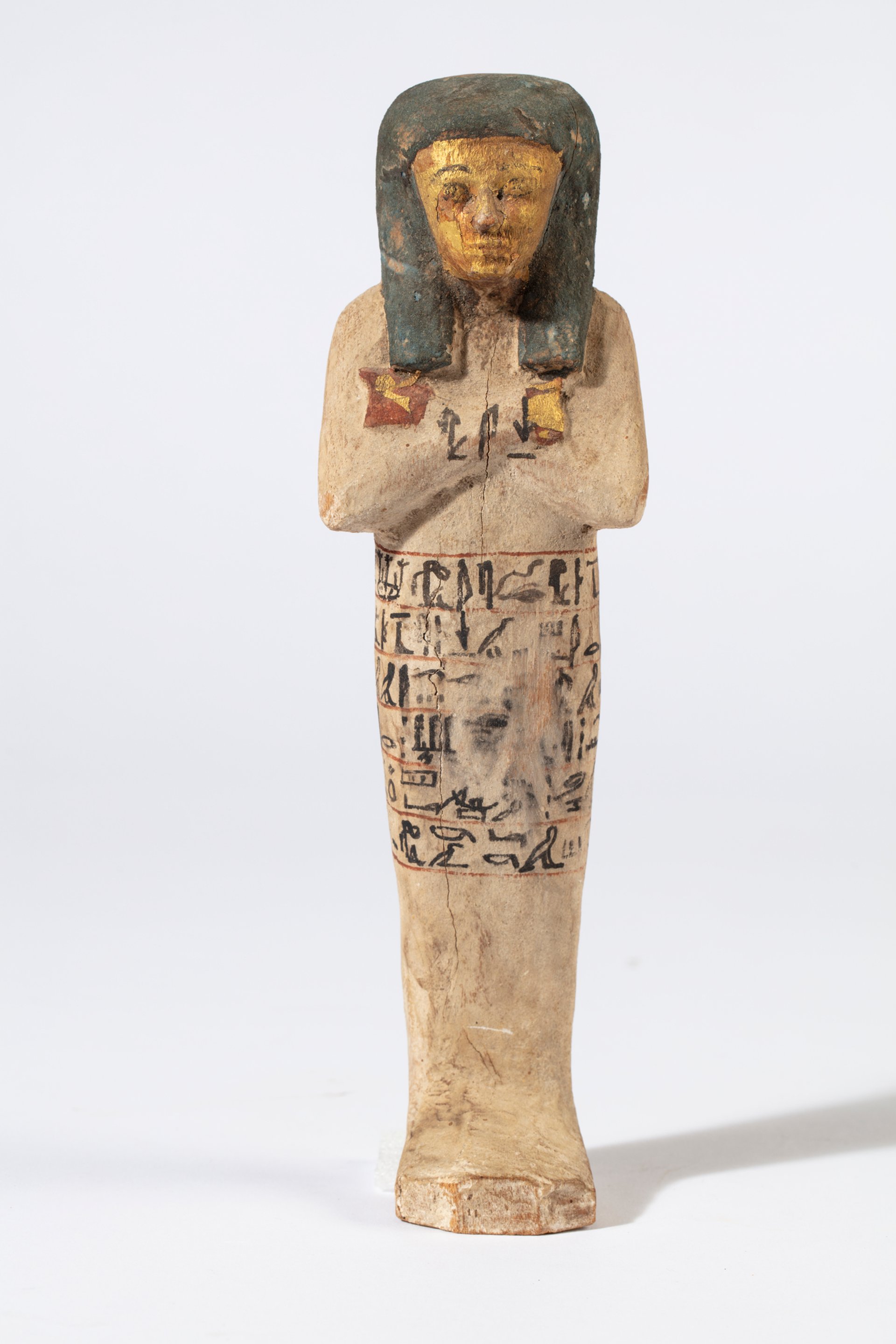 A spell from the book of the dead is painted on Senseneb’s shabti in hieroglyphics, and her nickname Seni is also written on her chest and on her miniature coffin. Her face and hands are painted gold.