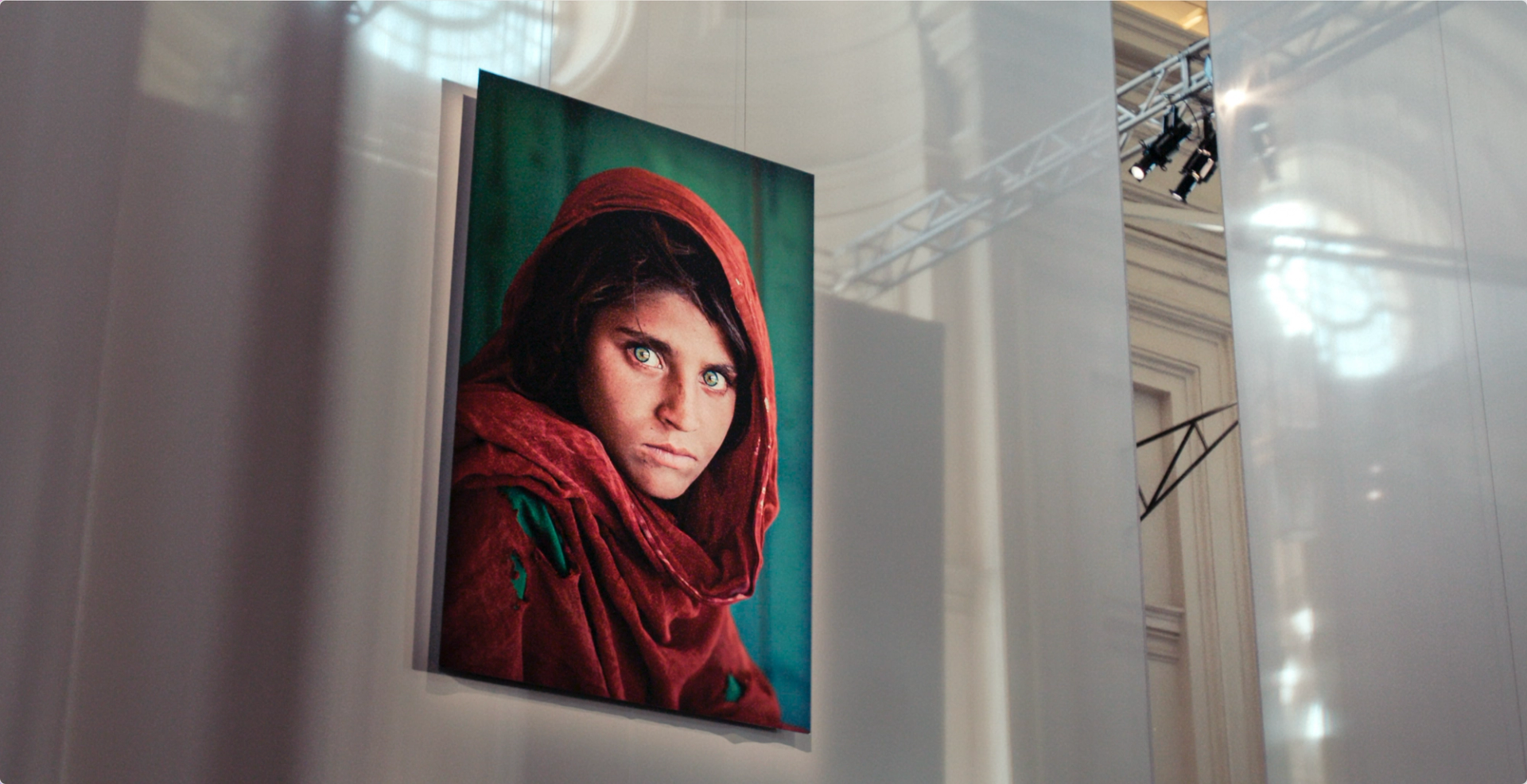 Installation shot of Steve McCurry's portrait of the 12-year-old Pashtun girl Sharbat Gula, which appeared on the June 1985 cover of National Geographic © McCURRY: THE PURSUIT OF COLOR