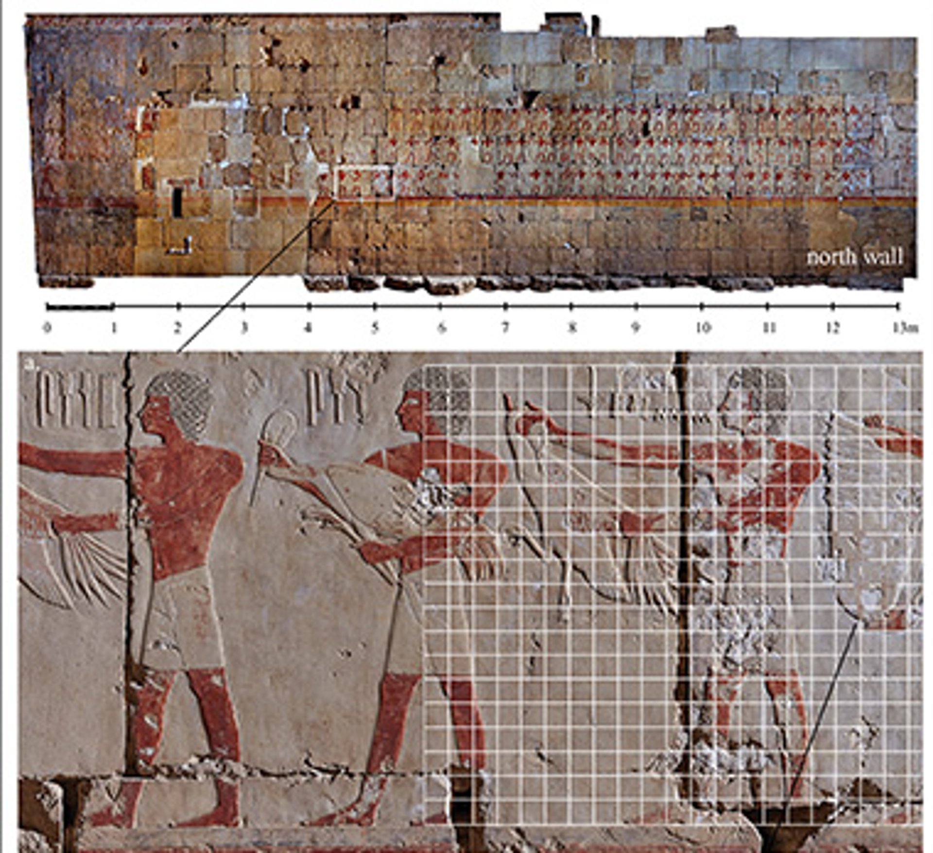 Remains of a square grid in the Chapel of Hatshepsut and its reconstruction for the entire figure of an offering-bearer © photo by J. Kosciuk & M. Jawornicki; grid reconstruction by the author)