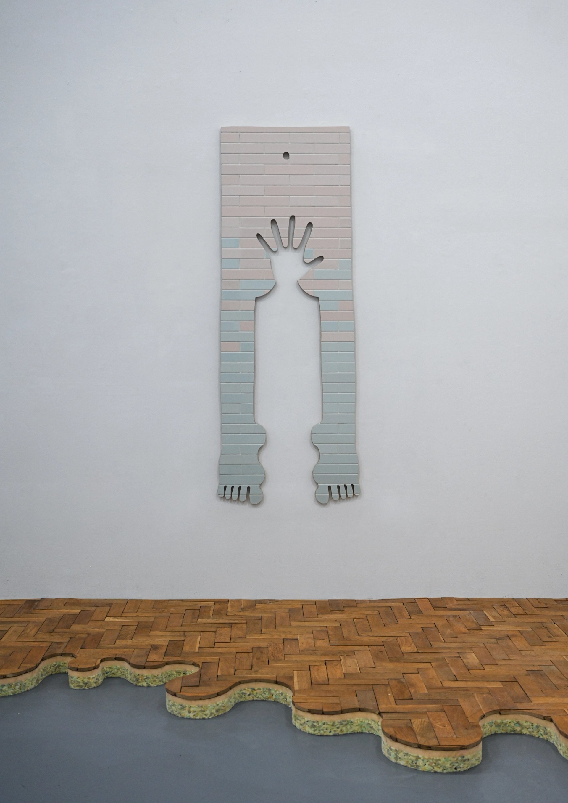 To step upon the central installation in the British artist Ally Rosenberg's first solo show is to be reminded, sharply and suddenly, of the disconnect that exists between body and mind. Solid wood parquet flooring—cut into the shape of a large cartoon puddle—is laid over a thick layer of foam, easily visible to viewers upon approach. The concept is utterly simple: you place your weight on it, you quickly sink into it. The result is no less shocking for the fact that Rosenberg willingly shows his hand. What is known and what is felt can sometimes be wholly different things, and humans, he is keen to prove, are not designed to be thrown off balance. This literal, slapstick humour informs our reading of the show’s further works: wall-hanging ceramics and freestanding installations constructed from doors, all cut out with crude shapes of large-scale hands and feet and smaller penises.