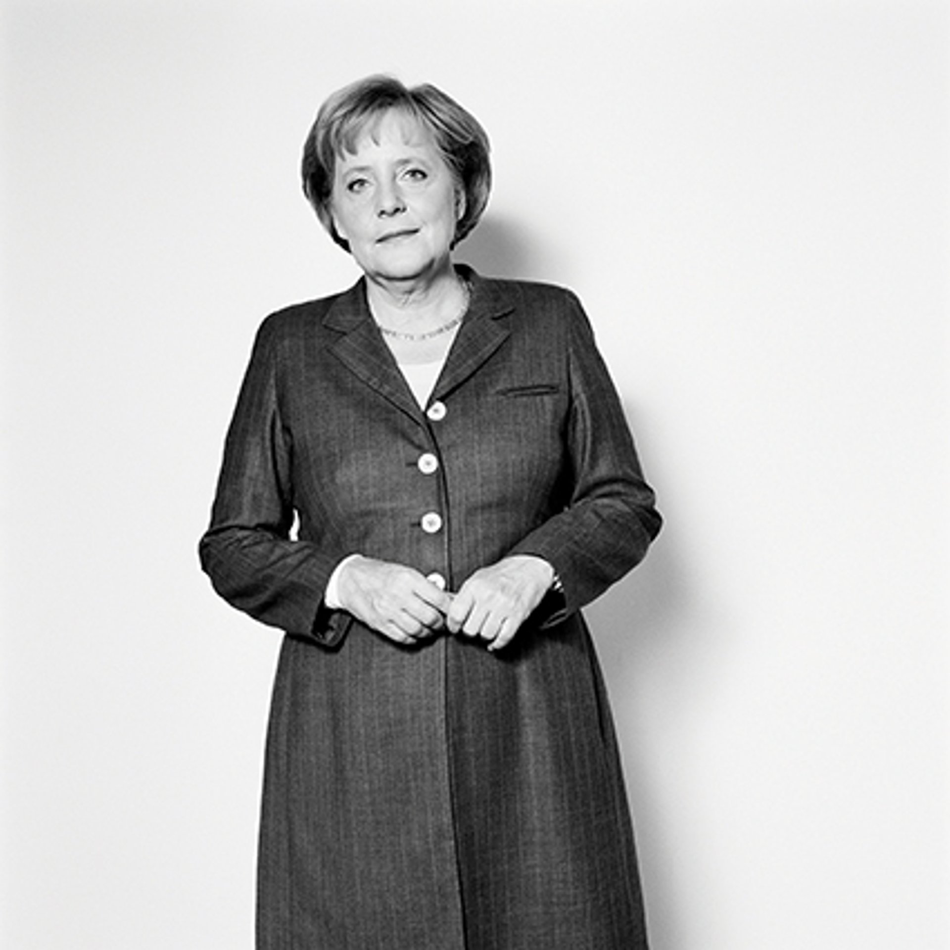 She took two portraits each time, a head shot and a three-quarter-length standing pose, and avoided any of the trappings of power. The backdrop is a white wall and a simple chair. “Most politicians put on a certain smile when they see a camera,” Koelbl says. “I asked her to look at me with a calm, open gaze. Then the posing was gone.”