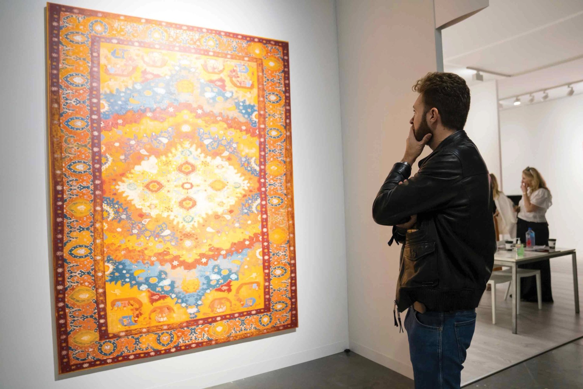 This painting by the Iranian-British artist Kour Pour is nearly impossible not to mistake for a Persian carpet. Pour added 20 layers of gesso with a thick, bristled push broom, both from top to bottom and from side to side, to give a cross-hatched, woven feel. Next, he added a layer of screen and hand printing before sanding some of it off and painting over the piece by hand. Pour continues the tradition of Persian carpets using patterns found on centuries-old textiles as the starting point for this work, priced at $200,000.