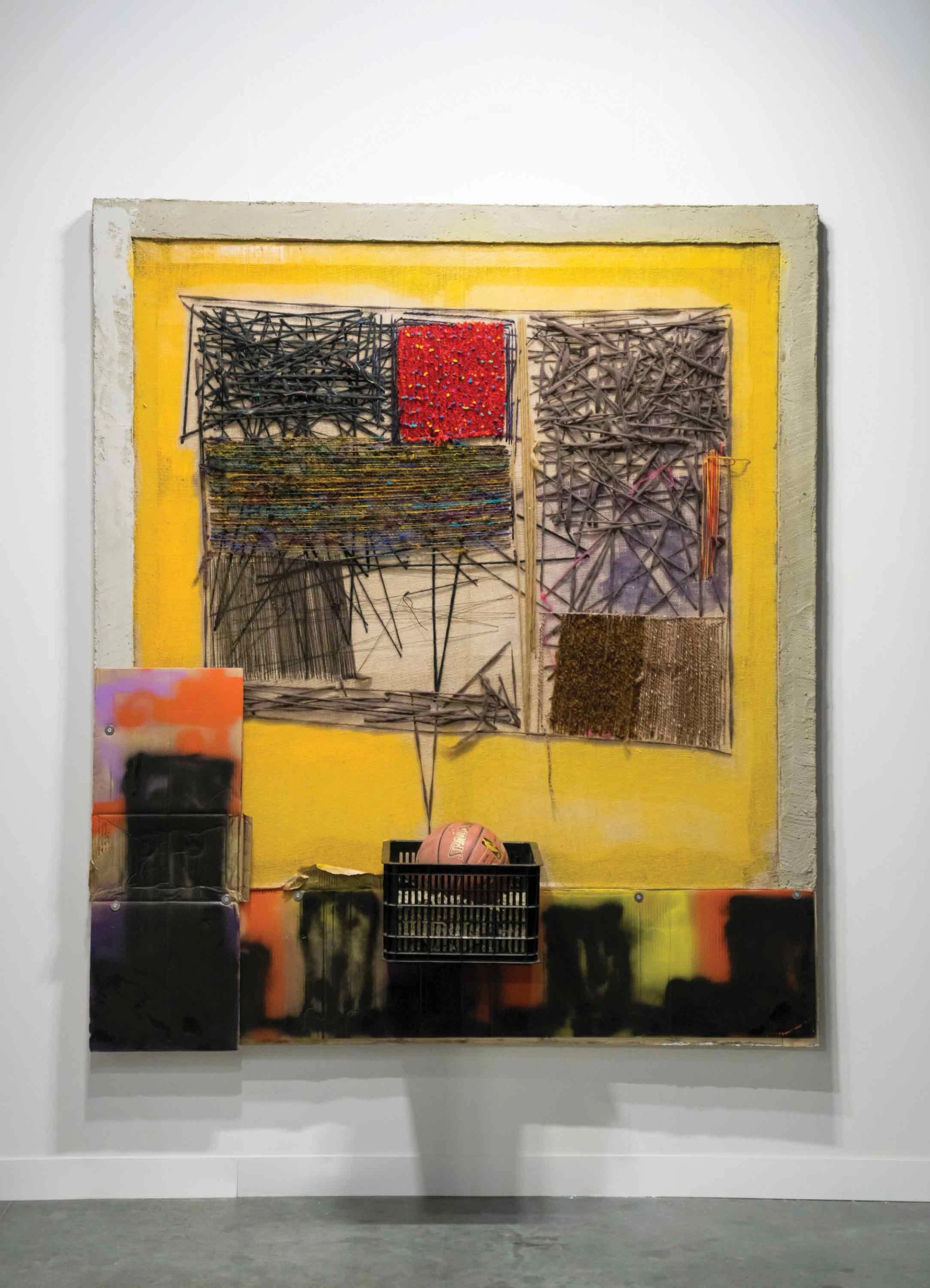 Born in Grenada and raised in Brooklyn, Alvaro Barrington merges his entire personal history into a massive concrete frame in this assemblage piece, priced at $90,000. Layers of dark yarn run jagged across a burlap sack that recalls his childhood years in the Caribbean. Spray-painted sections of cardboard and a milk crate basketball hoop call to mind the streets of Brooklyn, where he moved to at the age of 10 after his mother passed away, and the hip-hop culture from which he draws inspiration. “The thing about Alvaro is he’s endlessly experimenting,” says the gallerist Tim Blum. “There’s no fear and there’s no limit.”