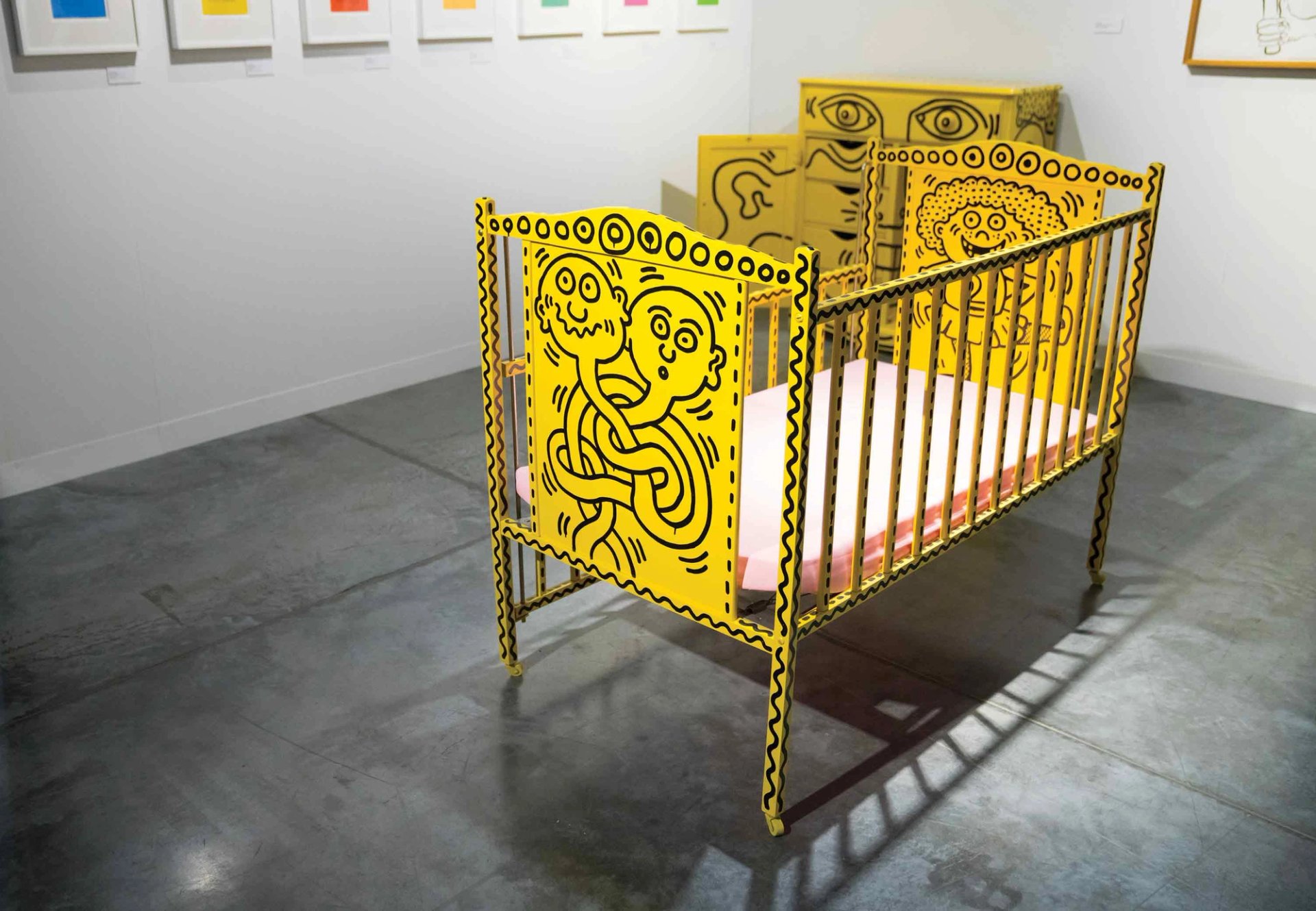 A bright yellow crib and dresser on the stand of Jeffrey Deitch at Art Basel in Miami Beach is turning heads. And visitors are even more surprised when they find out that the eye-popping baby items were made by Keith Haring. Deitch explains that the legendary late street artist made the enamel-on-wood items for the children of his long-time friend, Kermit Oswald. The pair met as kids in Kutztown, Pennsylvania, and remained firm friends. “We [had given] each other works since we were children,” Oswald, an artist himself, told the Sotheby’s website. Deitch hopes the works will be bought for someone else’s children, bringing a happy ending to this Haring story.