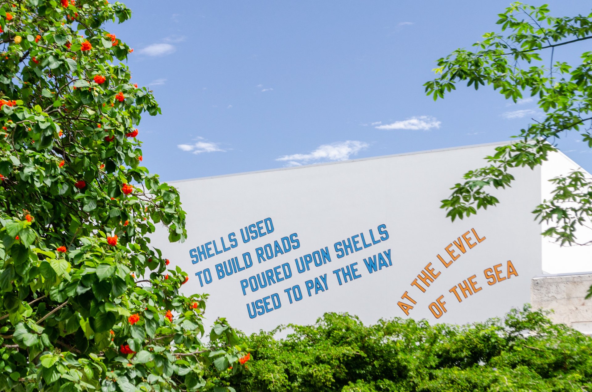 Lawrence Weiner, SHELLS USED TO BUILD ROADS POURED UPON SHELLS USED TO PAY THE WAY, AT THE LEVEL OF THE SEA (2008), at the Bass Museum, Miami Photo by Zaire Kacz. Courtesy of Marian Goodman Gallery © 2021 Lawrence Weiner / ARS, New York