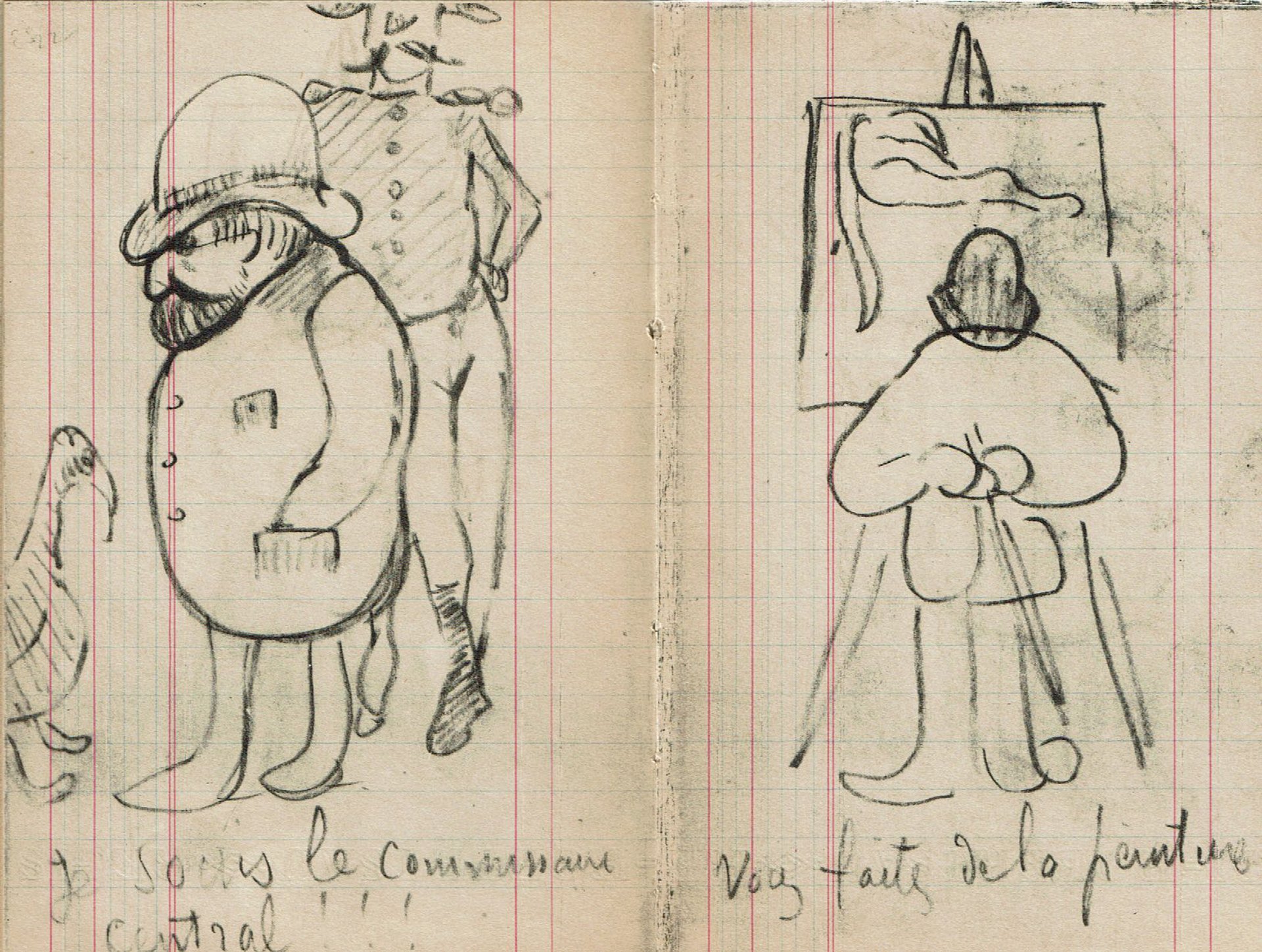 Paul Gauguin’s sketches of the chief of police Joseph d’Ornano—the mocking captions translate as “I am the chief of police!!!” and “You make paintings” Credit: Reproduced in René Huyghe, Le Carnet de Paul Gauguin, Quatre Chemins, Paris, 1952