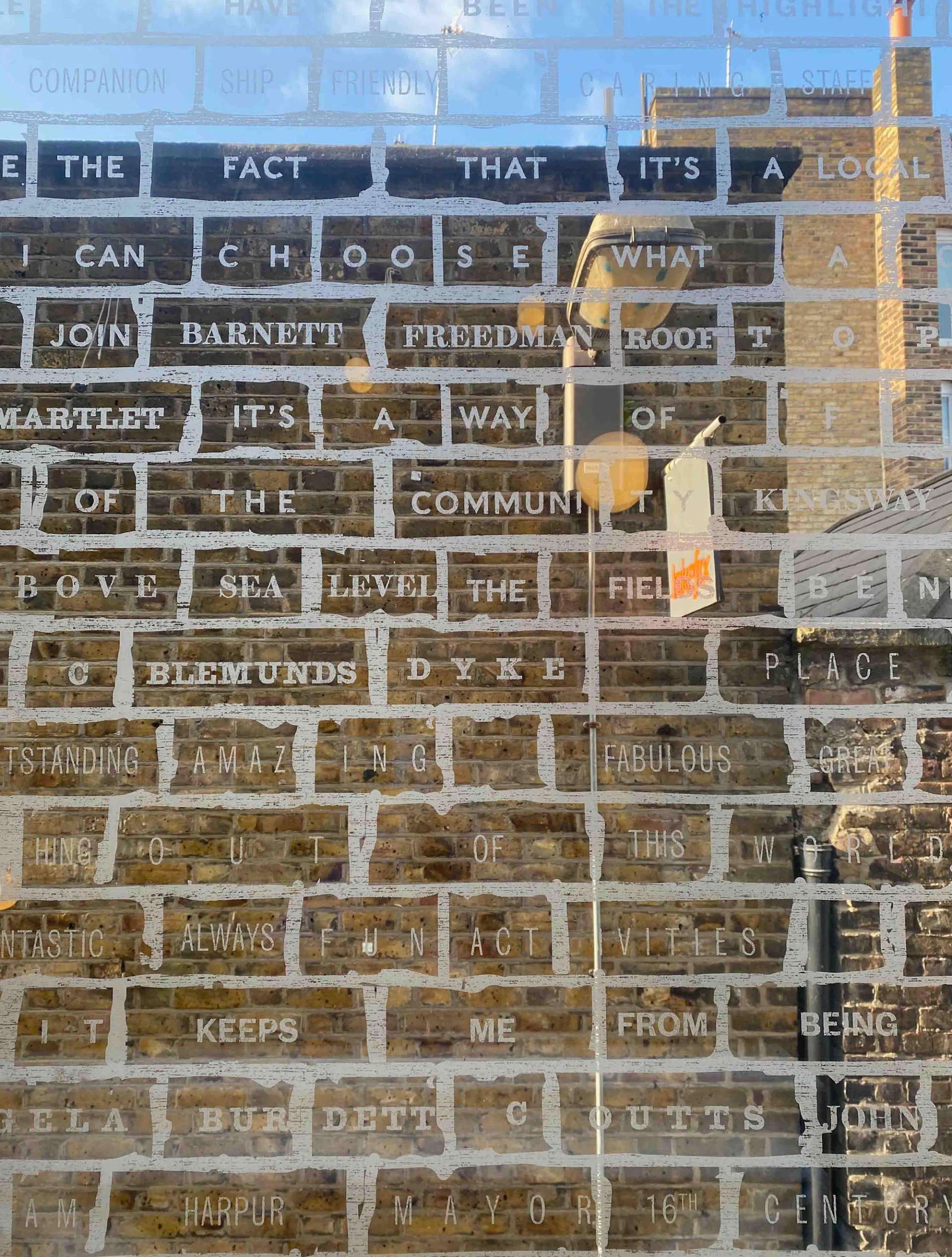 Inscribed into this ghostly brickwork tracery are words which, in a range of fonts, allude to the rich and multiple histories of the site, its surroundings and its communities past and present. There are phrases, personal testimonies, names of places as well as individuals both famous and lesser-known, gleaned from Thuring and Macdonald’s extensive research as well as from workshops and interviews with local people and HCA members. (The work’s title, Great Things Lie Ahead comes from old archive scrapbooks dating from the 1920s.) “I wanted to create something welcoming and timeless that conveyed the past, present and the future – a sort of time travel,” says Thuring, who described her process as “mapping and expanding the actual place of the building, the landscape, the people who have passed through, do now, and will pass through in the future”.