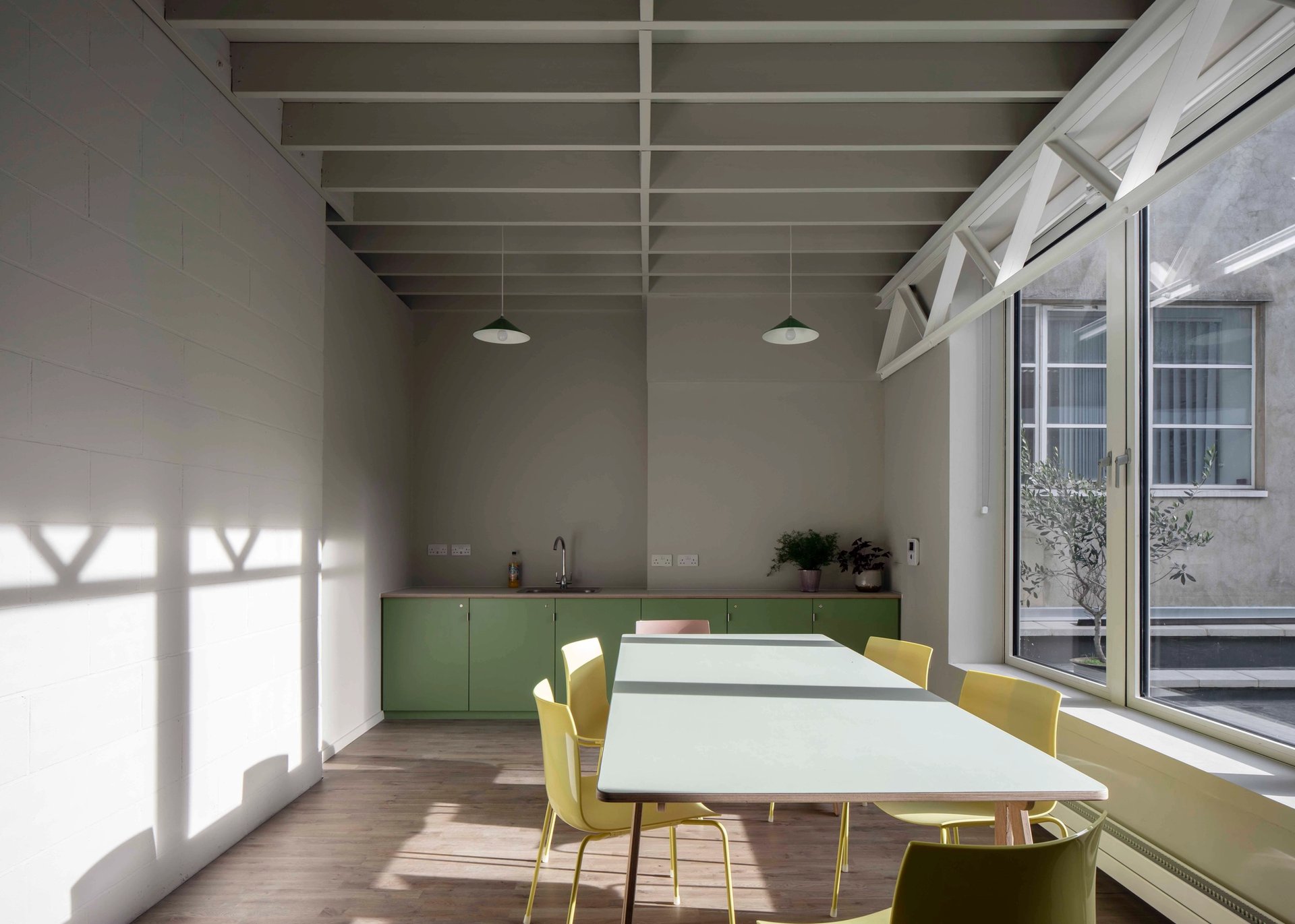 The tiles in the new kitchen, shower rooms and toilets also reflect the distinctive off-kilter palette of Thuring’s paintings which is offset by vivid green metalwork and stair rails, which are apparently also a nod to Holborn’s distant past as a favoured forested hunting ground for the mayor of London in the 16th century.