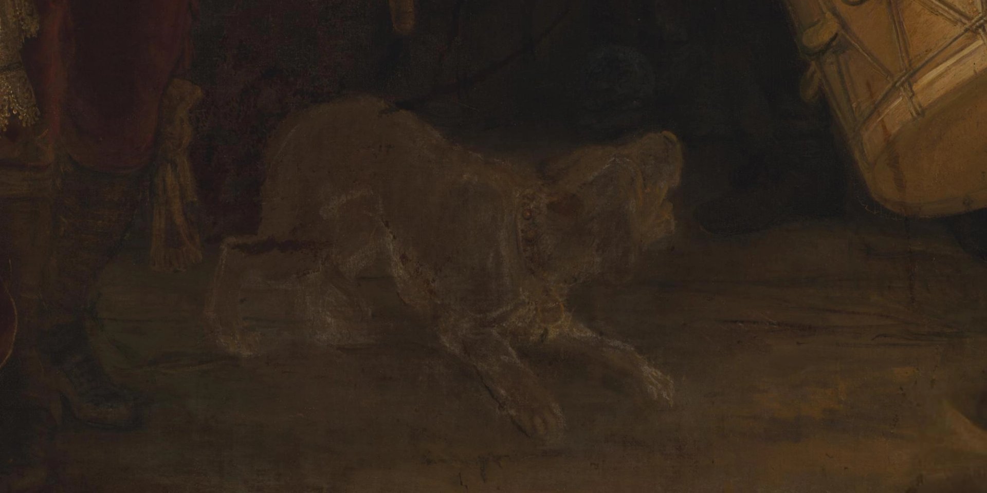 Another deterioration is the depiction of the dog at the bottom of the composition, between the central figures and the drum on the right. New research suggests that abrasion in the distant past means that the dog is much lighter than Rembrandt intended.