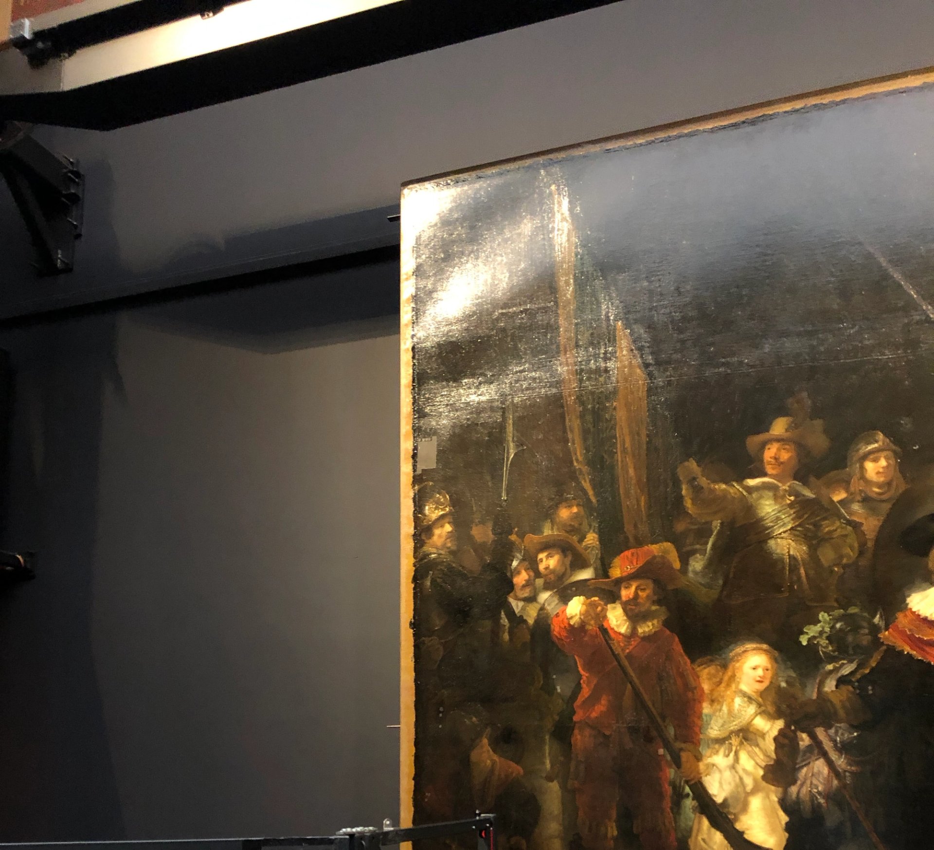 A disturbing problem that emerged during the research is a deformation of the canvas in the upper-left corner. This rippling developed only relatively recently, after The Night Watch was transferred from its normal position in the Gallery of Honour to the adjacent Phillips Wing during the lengthy restoration of the main building a decade ago. The deformation is a salutary reminder of the problems that can develop when moving such a large painting into a slightly different environment.