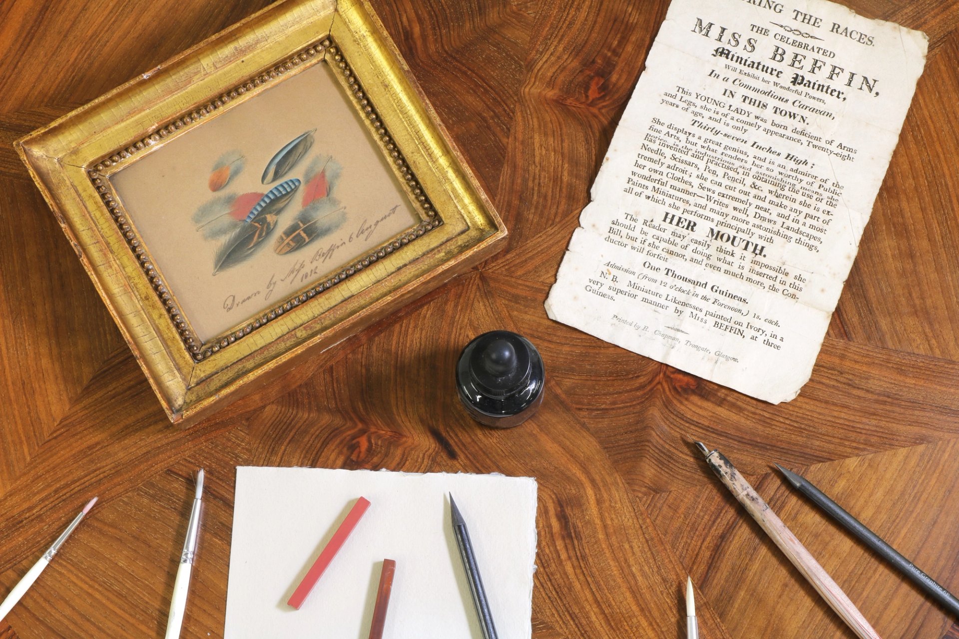 Now, a rare watercolour study of feathers, inscribed in pen “Drawn by Miss Biffin, 6th August 1812”, is going under the hammer at Sworders auctioneers in Essex with an estimate of £3,000 to £5,000. It is being sold together with a handbill advertising her as an attraction “During The Races”, describing her as “born deficient of arms and legs, she is of comely appearance, twenty-eight years of age, and is only thirty-seven inches high”.