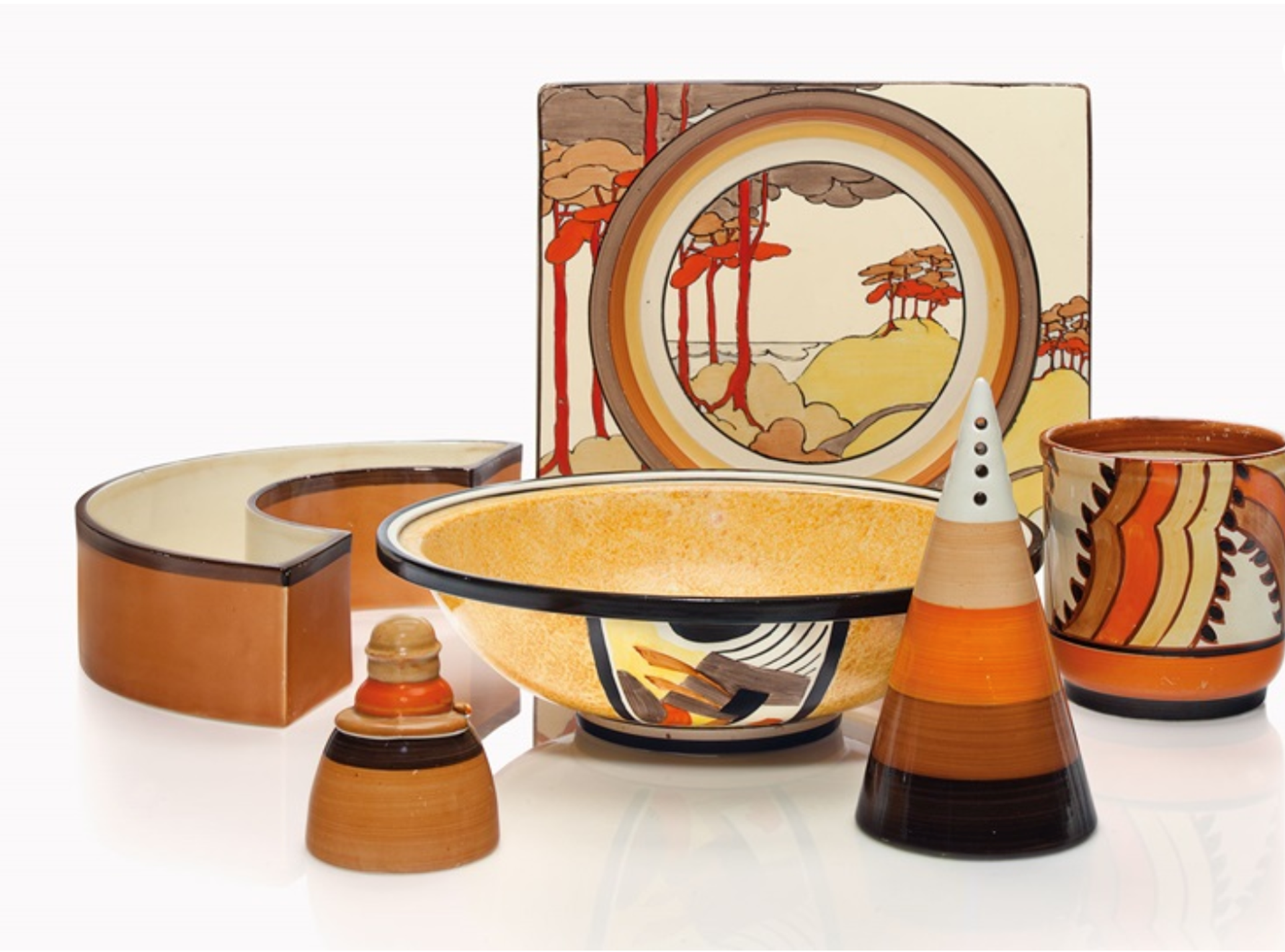 A group of Clarice Cliff wares. 20th century, various black printed script, sold at Christie's in 2017. Courtesy of Christie's