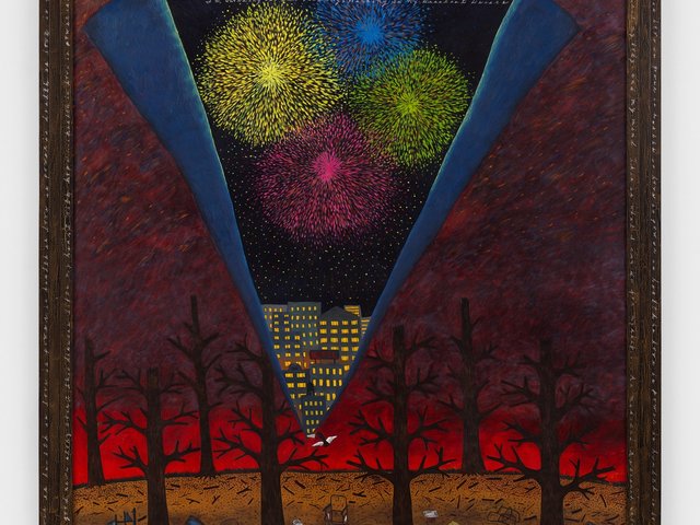 The weather forecast in Ann Toebbe’s Chicago neighbourhood regularly predicts that it will be cooler by the lake, but it took time for her to be cool with calling the lakeside area home. “Hyde Park isn’t considered a happening neighbourhood,” the artist says about the quiet Chicago district she moved to in 2005, from a more happening Brooklyn. Her second solo show at Tibor de Nagy illustrates acceptance of her adopted address rendered in nine detailed paintings that combine collage, drawing and gouache. This is the first time that Toebbe—known for dollhouse-like compositions portraying homes of family and friends—has made a series about Hyde Park. It includes figures, rare in her work, like the old men having coffee at Bonjour Bakery (all works 2021) alongside its curmudgeonly French owner. Other paintings reference famous past residents, as in Obama’s House which comically shows overgrown evergreens guarding the former president’s home. Toebbe’s own condo complex, depicted in East View Park, housed the Obamas for over a decade.
