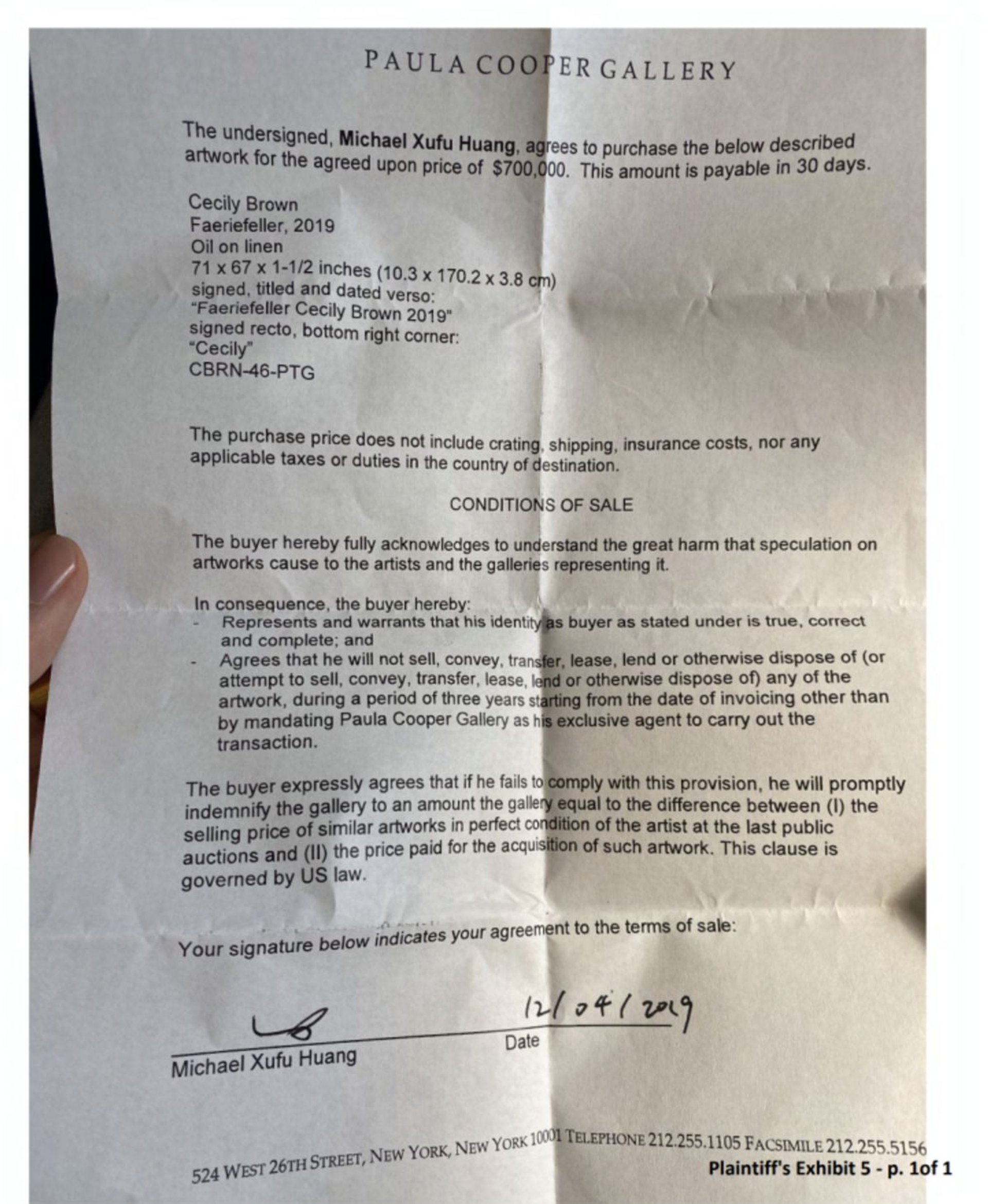 A contract signed by Michael Xufu Huang following the purchase of Cecily Brown's Faeriefeller (2019) from Paula Cooper Gallery