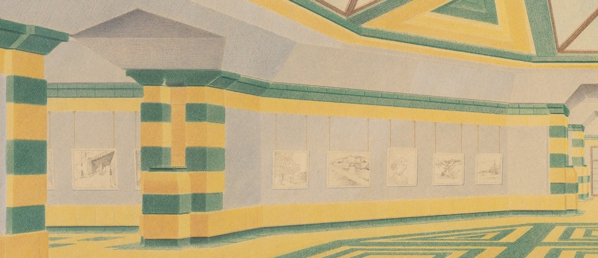 Our reconstruction shows just one quarter of the huge symmetrical central hall. There would have been 20 Van Goghs in this room, with the remainder in two side galleries. Dominating the architecture is extremely bold green-and-yellow geometric patterning —on the floor, the apparent skylight and the corners.