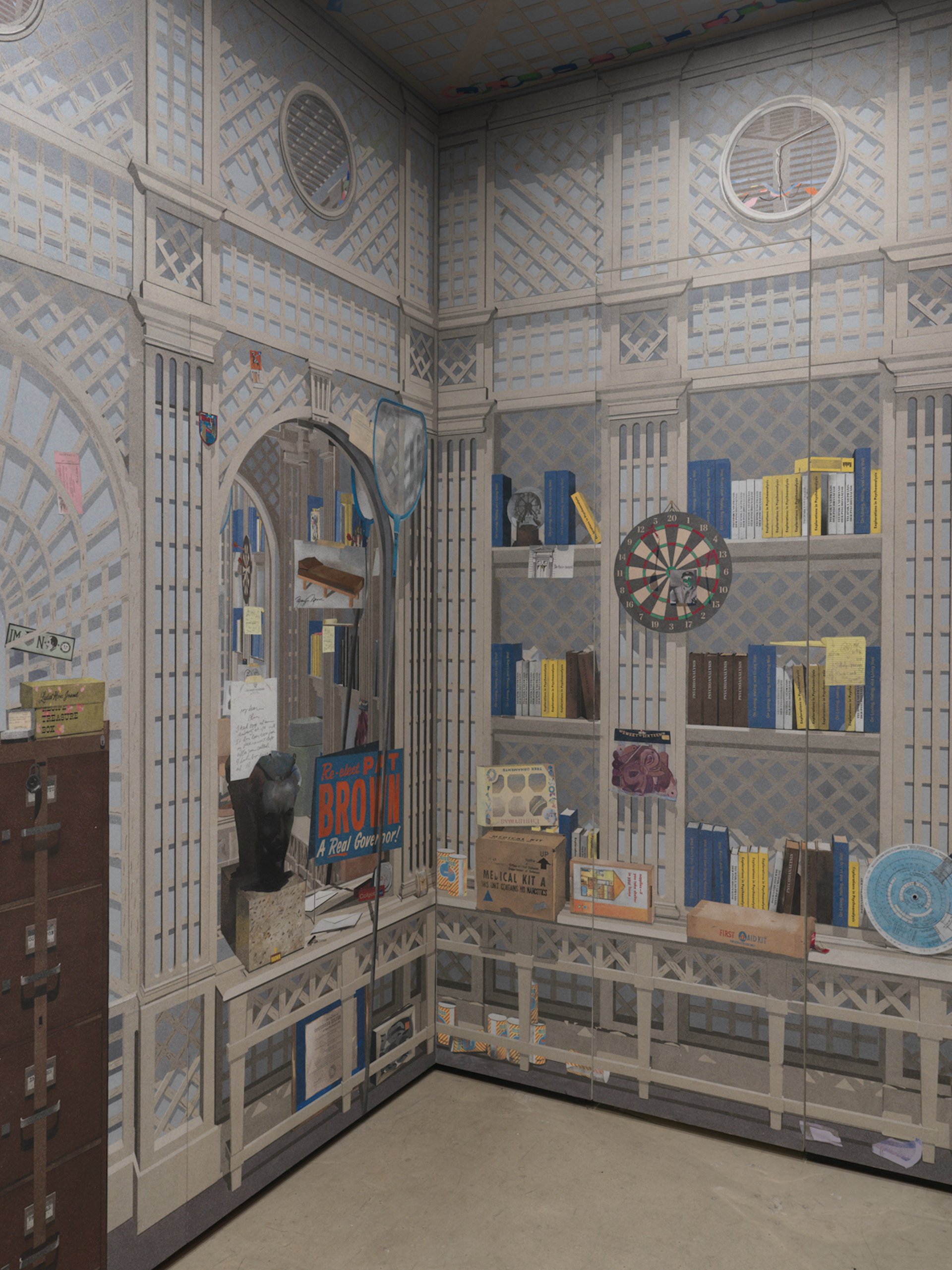 Stepping into Cynthia Talmadge’s installation at 56 Henry, an ambitious gallery in a space the size of a walk-in closet, is like traveling to another place and time—though it might more accurately be described as a mashup of several different places. In exacting sand paintings that cover the walls and ceiling, the artist has created an architectural trompe l’oeil installation inspired by the 15th century studiolo from the Ducal Palace in Gubbio, now in the Metropolitan Museum’s collection. Studiolos were traditionally places for studious reflection, and this one offers plenty to study with its enigmatic mix of objects from 12305 Fifth Helena Drive, Marilyn Monroe’s home when she died in 1962, and nearby 902 Franklin Street, her psychoanalyst Ralph Greenson’s home at the time. The detective work of attributing the depicted objects to Munroe or Greenson becomes even more complicated with the knowledge of the psychoanalyst’s bizarre course of treatment for the Hollywood icon. For Talmadge, it seems, there is no clear solution or takeaway, only fascinating webs of connections and reflections in which to get caught up.