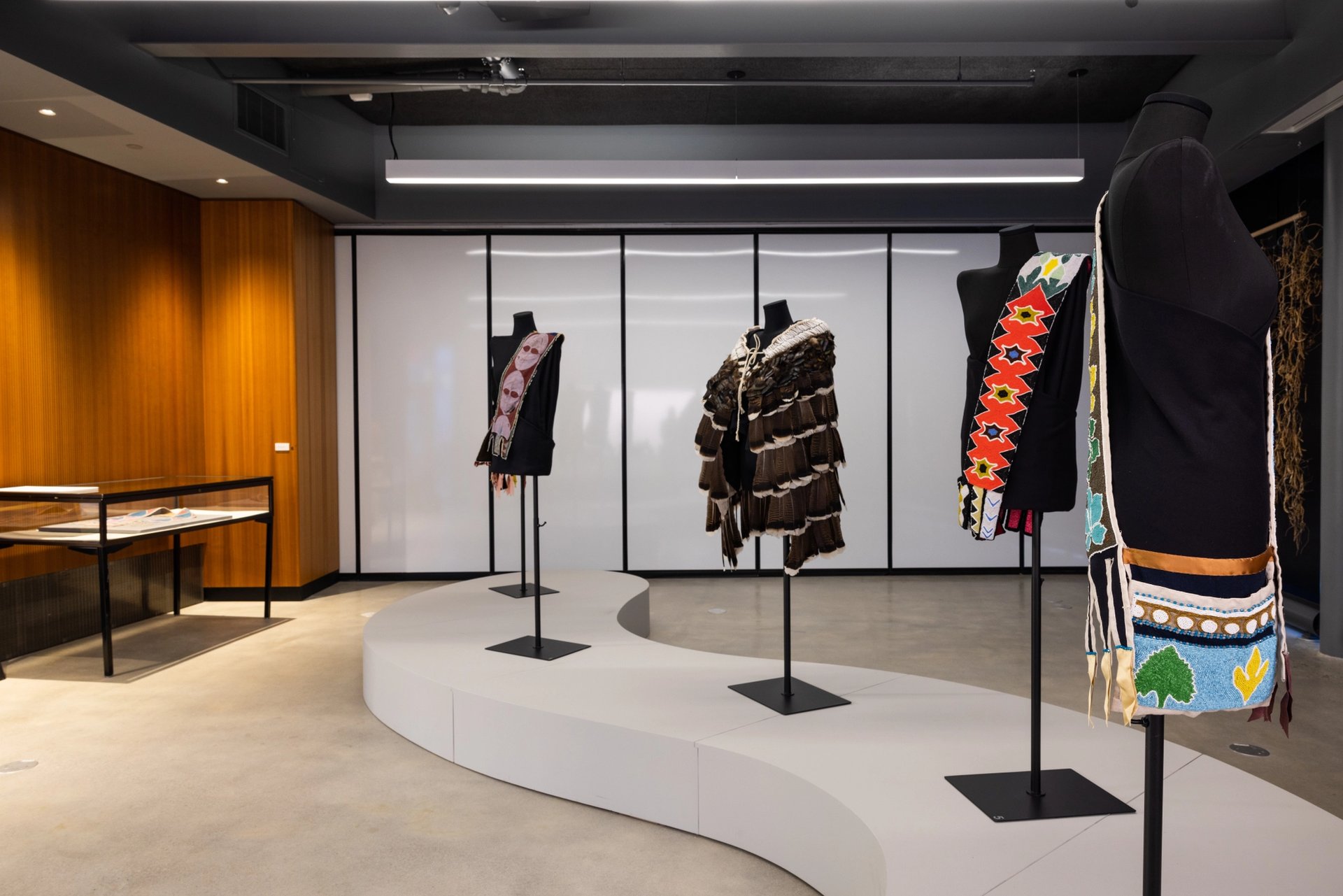 The sparseness of the exhibition itself poignantly echoes the fact that the Lenape were among the Indigenous communities most afflicted by colonisation and forced removal. It features a small vitrine containing context writings, a strikingly well-preserved beaded bandolier bag from around 1850, tapestries, a bandolier bag made by Baker in 2014 containing traditional organic patterns, and a cape crafted last year from turkey feathers by the artist and poet Rebecca Haff Lowry.