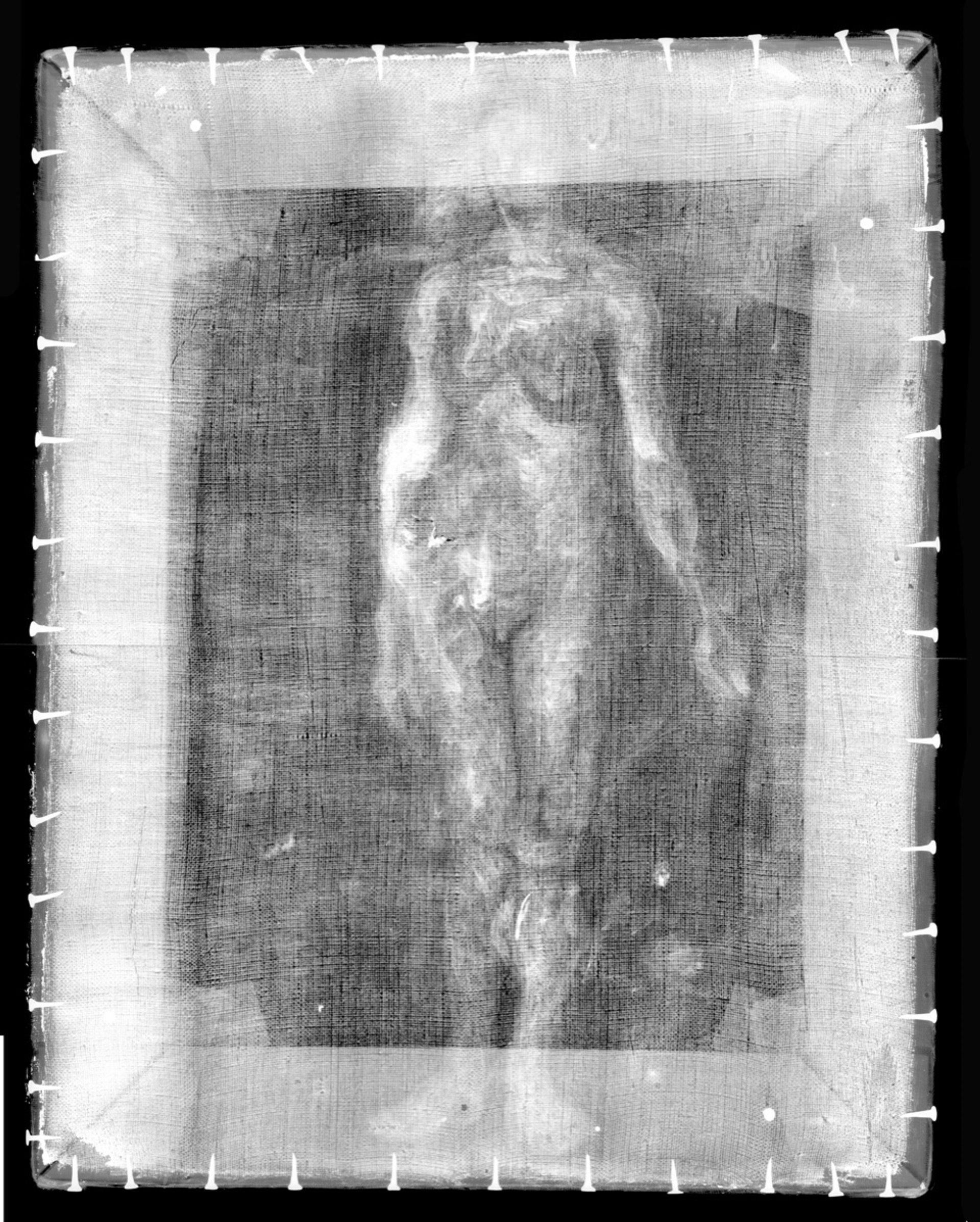 X-radiograph of Self-portrait with Felt Hat, depicting a nude standing woman underneath Credit: Van Gogh Museum, Amsterdam