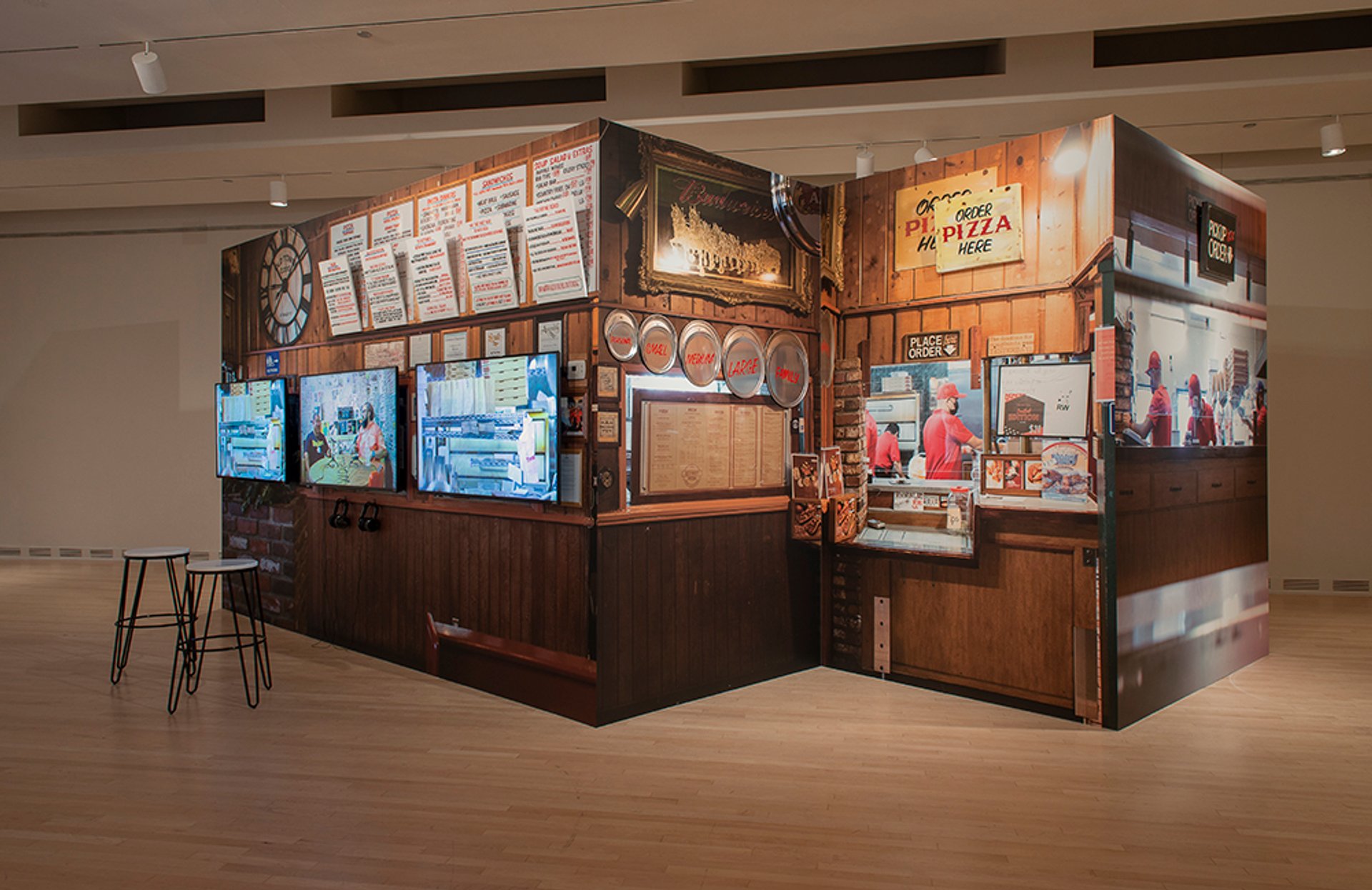 The 12 artists selected for the exhibition were asked to create works that critique what has often been veiled from the public narrative, introducing personal stories. Among some of the major works included, the artist Mario Ybarra Jr. has created a work titled Personal, Small, Medium, Large, Family (2021)—a diorama of a local pizza restaurant in his native Los Angeles, adorned with a photograph of a friend who was incarcerated as a teenager due to gang violence.