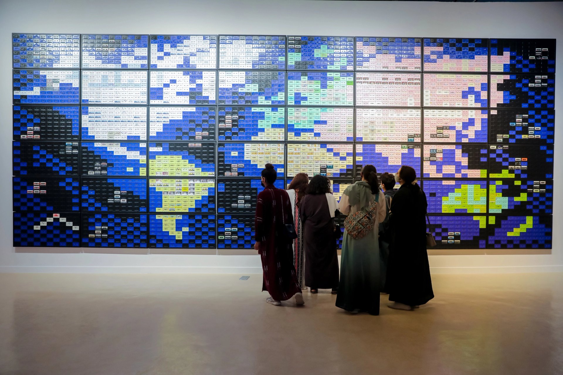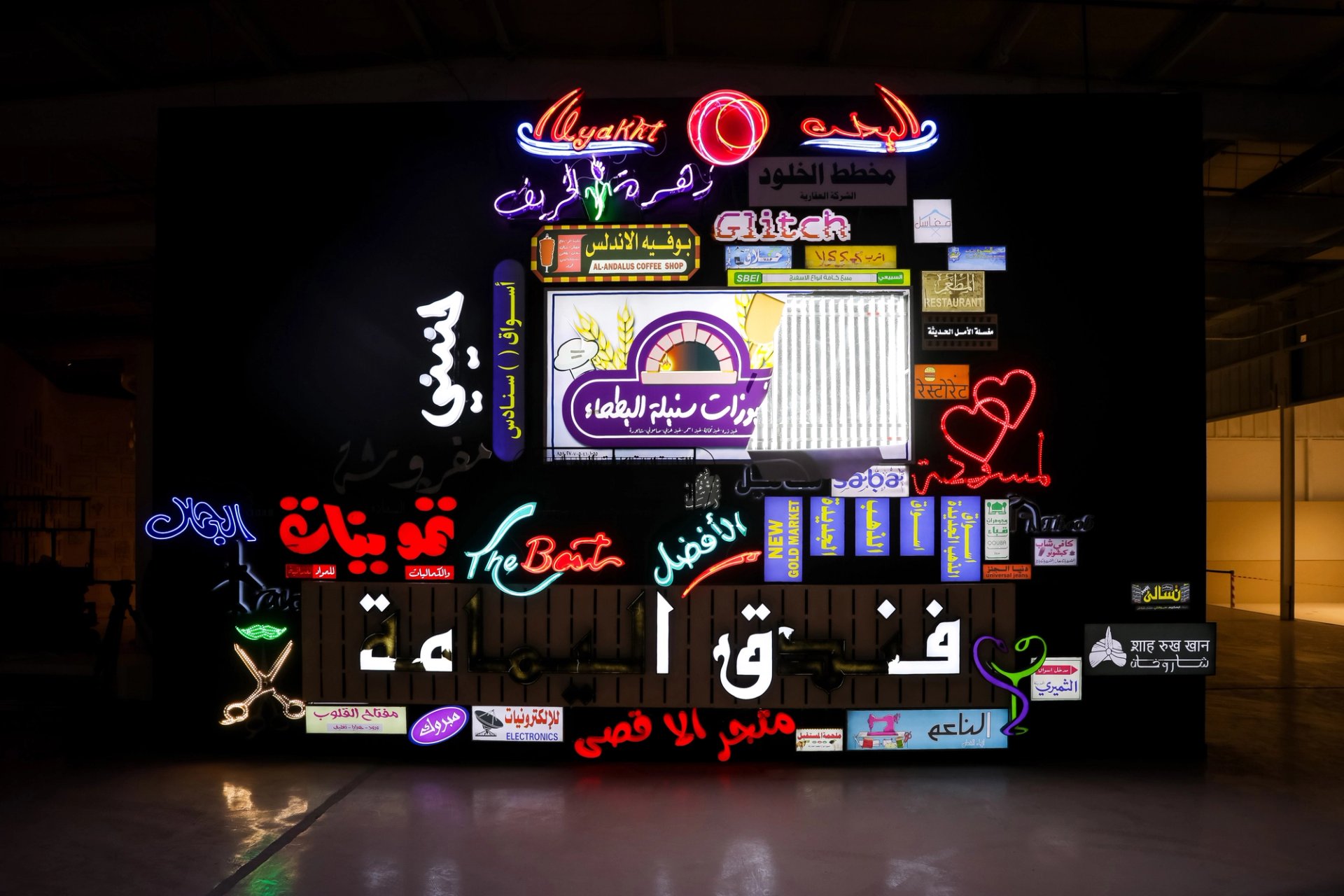Highlights include Maha Malluh’s Food for Thought, World Map installation (2021) commissioned by the Diriyah Biennale Foundation, which consists of 3,840 cassette tapes dating from the 1980s that play religious readings and Islamic texts. The mass of tapes depict a map of the world but their symbolic value, as reminders of a more communal pre-internet era, gives the work an extra dimension. Another Saudi artist, Abdullah Al Othman, is showing an eye-popping work entitled Manifesto: The Language & City (2021), an assemblage of neon lighting, lightboxes and found wooden signage evoking past and present street life in Saudi Arabia.