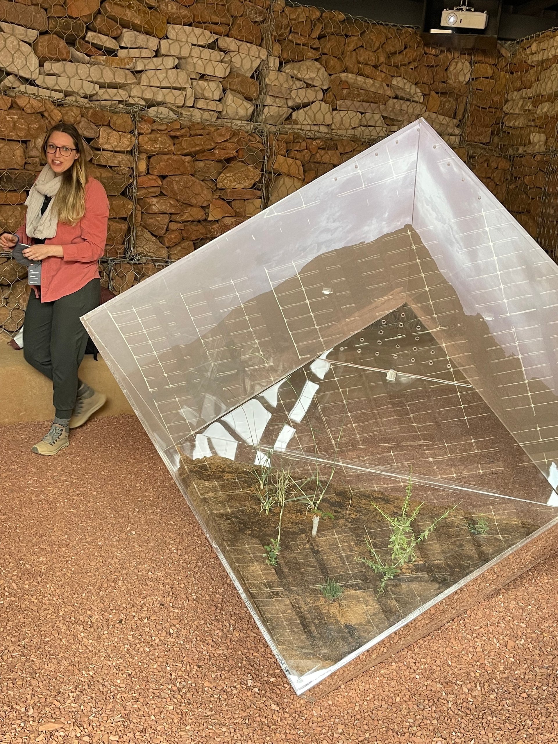 The work is dug like a cave into the ground. The rocks [used to create the walls] are local so it’s basically what you see outside, in the canyon. This work ended up being very beautiful because you see how it’s held together. The whole roof is made of solar panels which are pulling in power that’s being converted to power the projector and equipment; it’s also shining on the little greenhouse, helping to grow the plants, which are all native to the area and are part of research into the local environment.