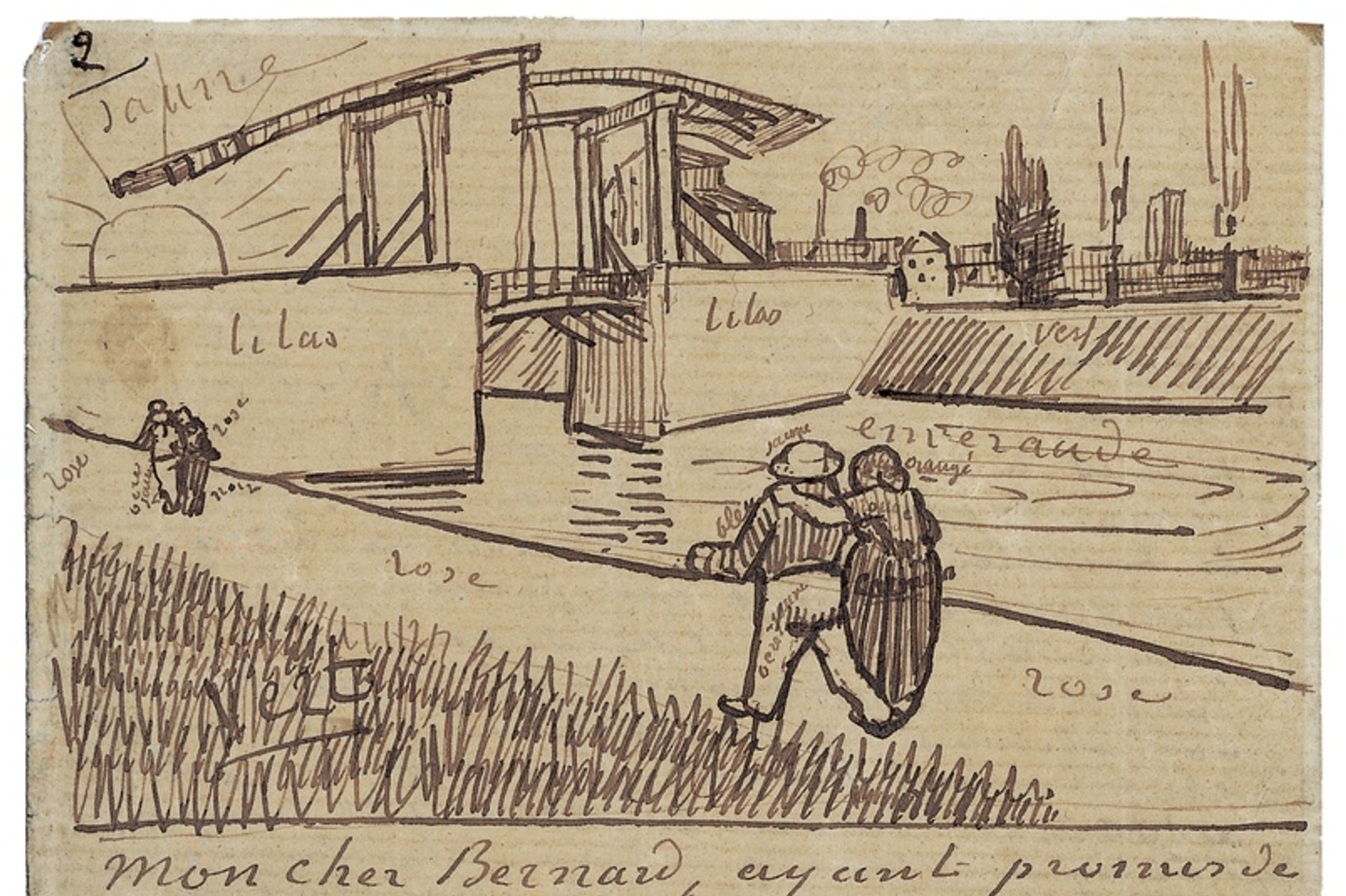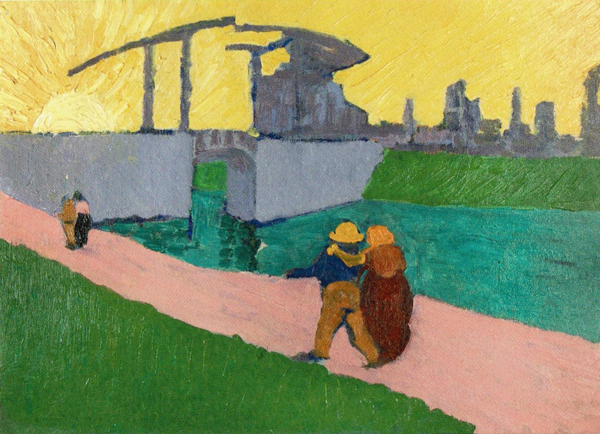 Van Gogh added a description of the landscape for Bernard: “At the top of this letter I’m sending you a little croquis [sketch] of a study that’s preoccupying me… sailors coming back with their sweethearts towards the town, which projects the strange silhouette of its drawbridge against a huge yellow sun.”