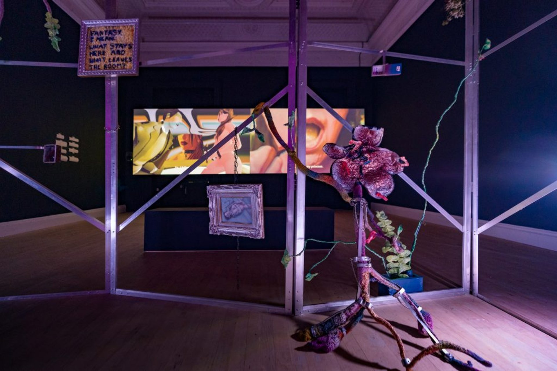 The show opens with Aisha Mirza’s bittersweet installation in which a cosy reception area, furnished with a pink fluffy rug, cushions, house plants and sex toys is overseen by a wall of domination apparatus and poster-sized text that memorably declares, “the best dick I ever had was a thumb & good intentions”. Less welcoming is the oppressive red environment in which Tobi Adebajo has installed three videos housed in curtained kiosks to examine themes of disability and desire, care and consumption framed within Yoruba traditions. Throbbing bass, an ominously vibrating cooking pot and fleshy ceramic fragments attached to the walls all add to an uncomfortably ambiguous atmosphere infused with a whiff of violence.