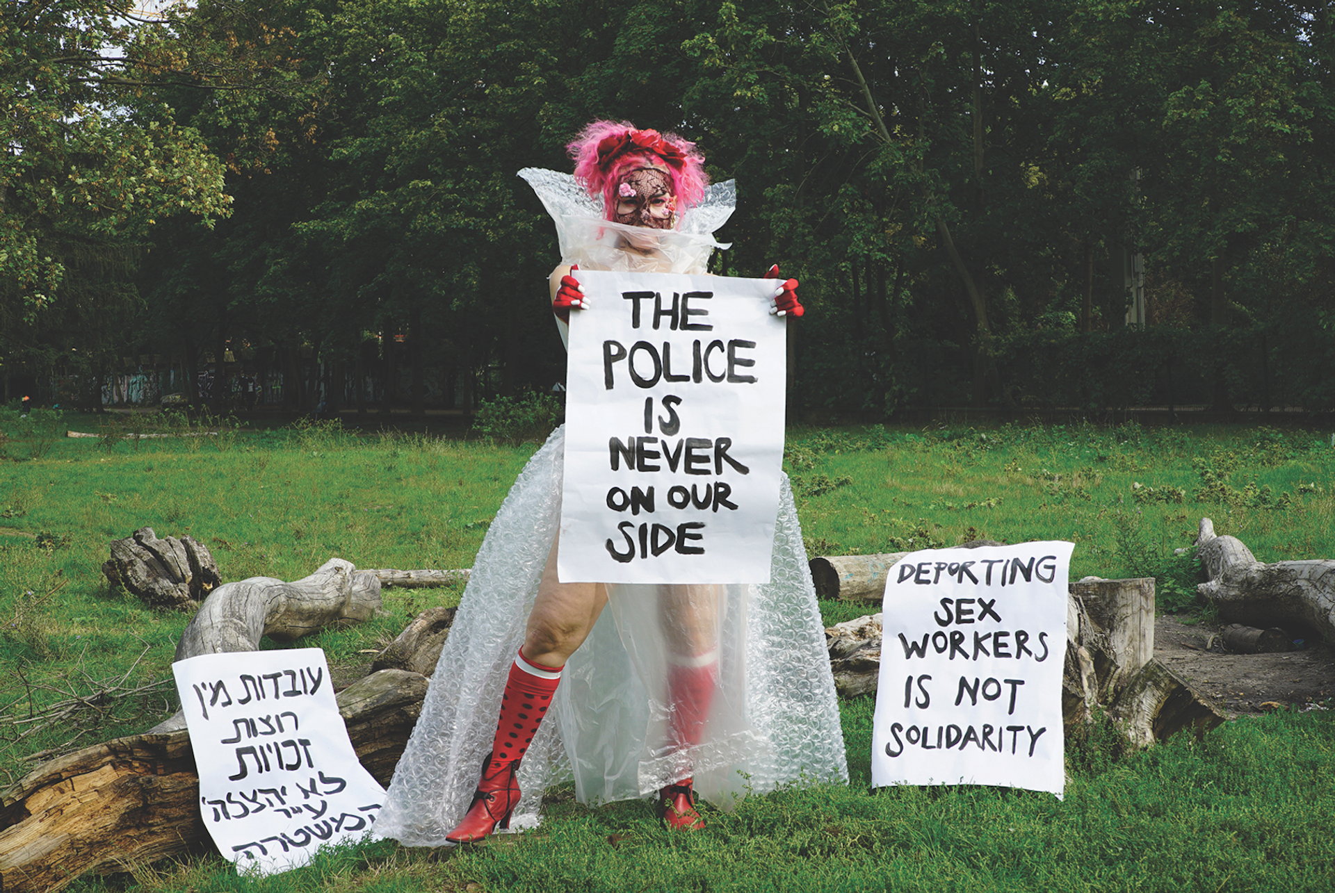 Performance artist and musician Liad Hussein Kantorowicz’s film Mythical Creatures focuses on the story of the Argaman Alliance, first sex worker organisation in Palestine-Israel; while another confrontational piece is Yarli Allison and Letizia Miro’s moving image work that splices animation and documentary-style footage to occupy the mind of a fictional client in search of the ideal sex worker.