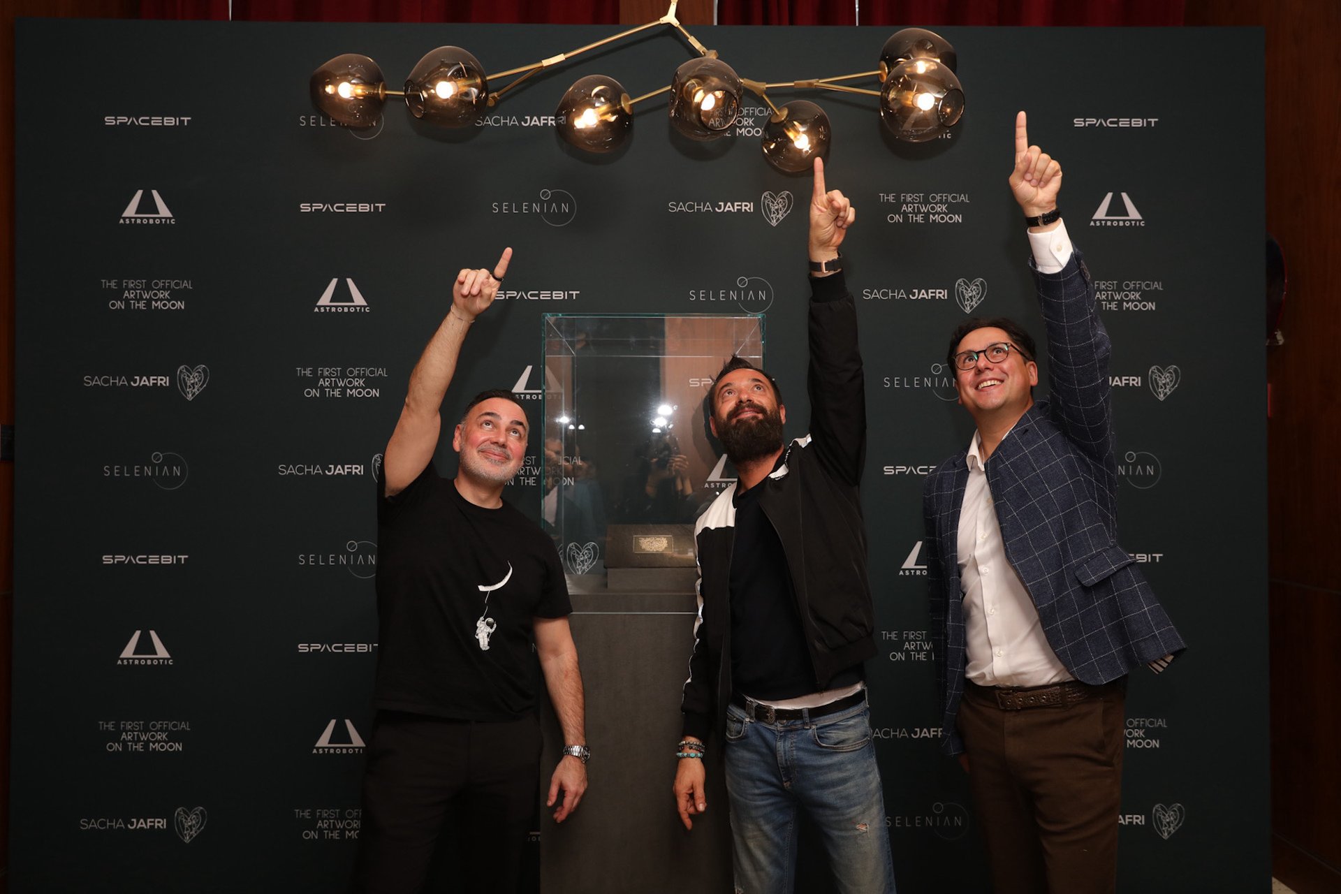 Selenia co-founder James Khazaei (left), artist Sacha Jafri (centre) and Spacebit founder Pavlo Tanasyuk (right) point spaceward during today's press conference in Dubai Photo courtesy Selenian