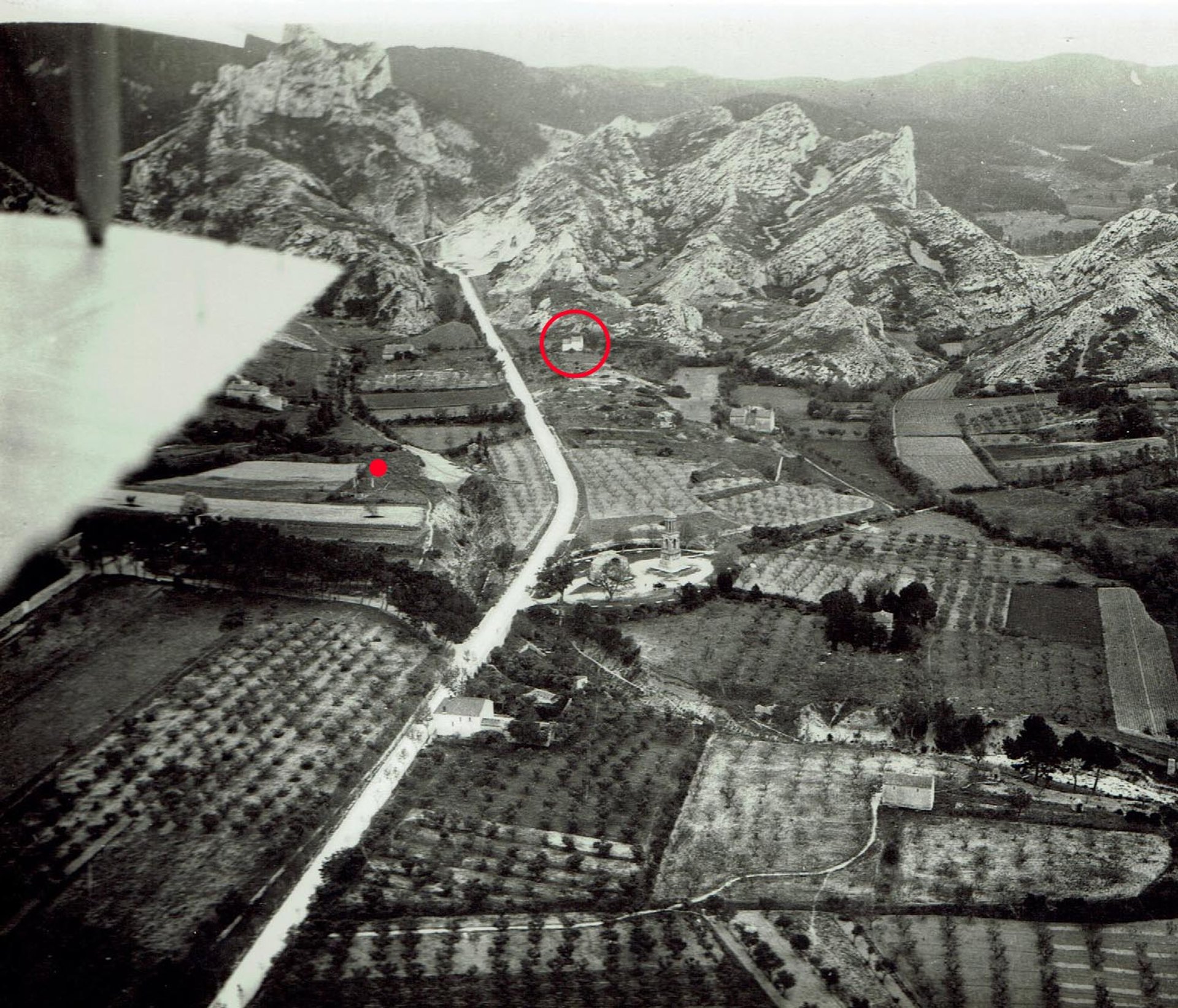 Aerial photograph of the area around the asylum of Saint-Paul-de-Mausole—Van Gogh was standing near the red spot and the farmhouse in the Fields near the Alpilles painting is circled, while three peaks in the Alpilles lie further away towards the horizon in the centre. The biplane aircraft wing appears on the left Photo: E. Michaud (before 1920); © Martin Bailey, all rights reserved