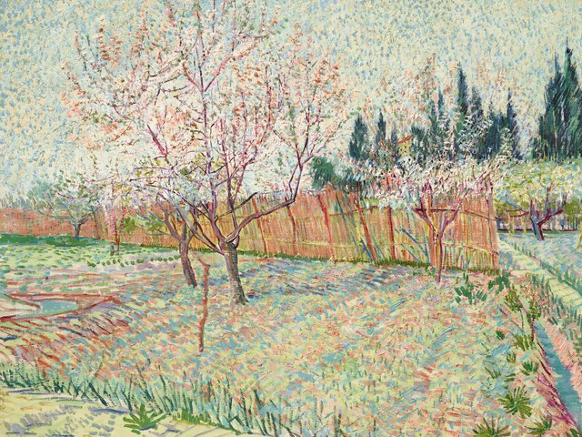 Looking back on Van Gogh’s time, the almond trees had already shed their leaves when he painted Fields near the Alpilles in November. But just three months later they would become the first fruit trees to blossom. In February 1890 Van Gogh was excited to see their white, fragrant blossom; a sign that spring was on the way.