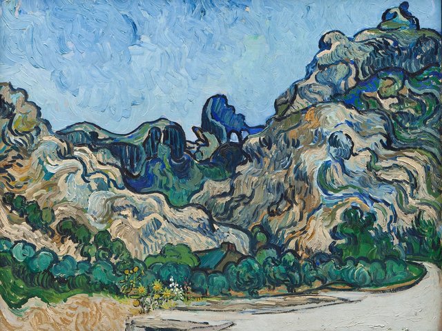 The dramatic hills in the background, facing south, are the chain of the Alpilles, the little Alps. Although Van Gogh represented the limestone hills as lilac in his painting, they now appear light blue, possibly because he used some red pigment that has since faded—which so often happens with the artist’s reds. The contorted hills have been delicately painted, with careful brushwork.