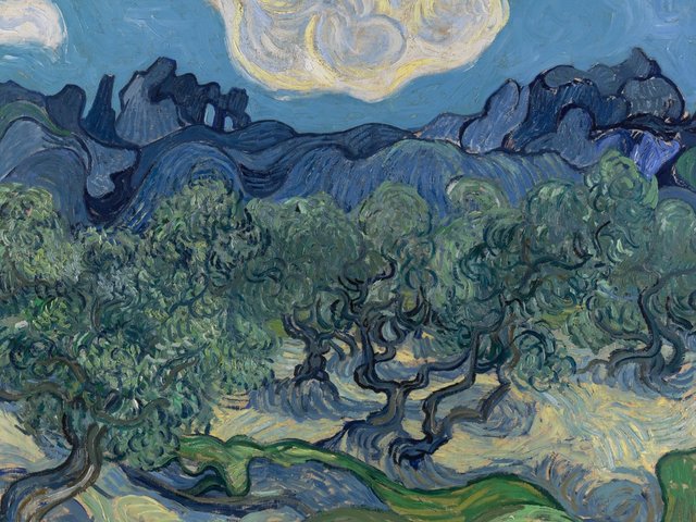 Look more closely, and there is a giant tree just to the left of the olive grove, almost towering over the hills (Van Gogh often exaggerated the height of isolated trees in his landscapes).