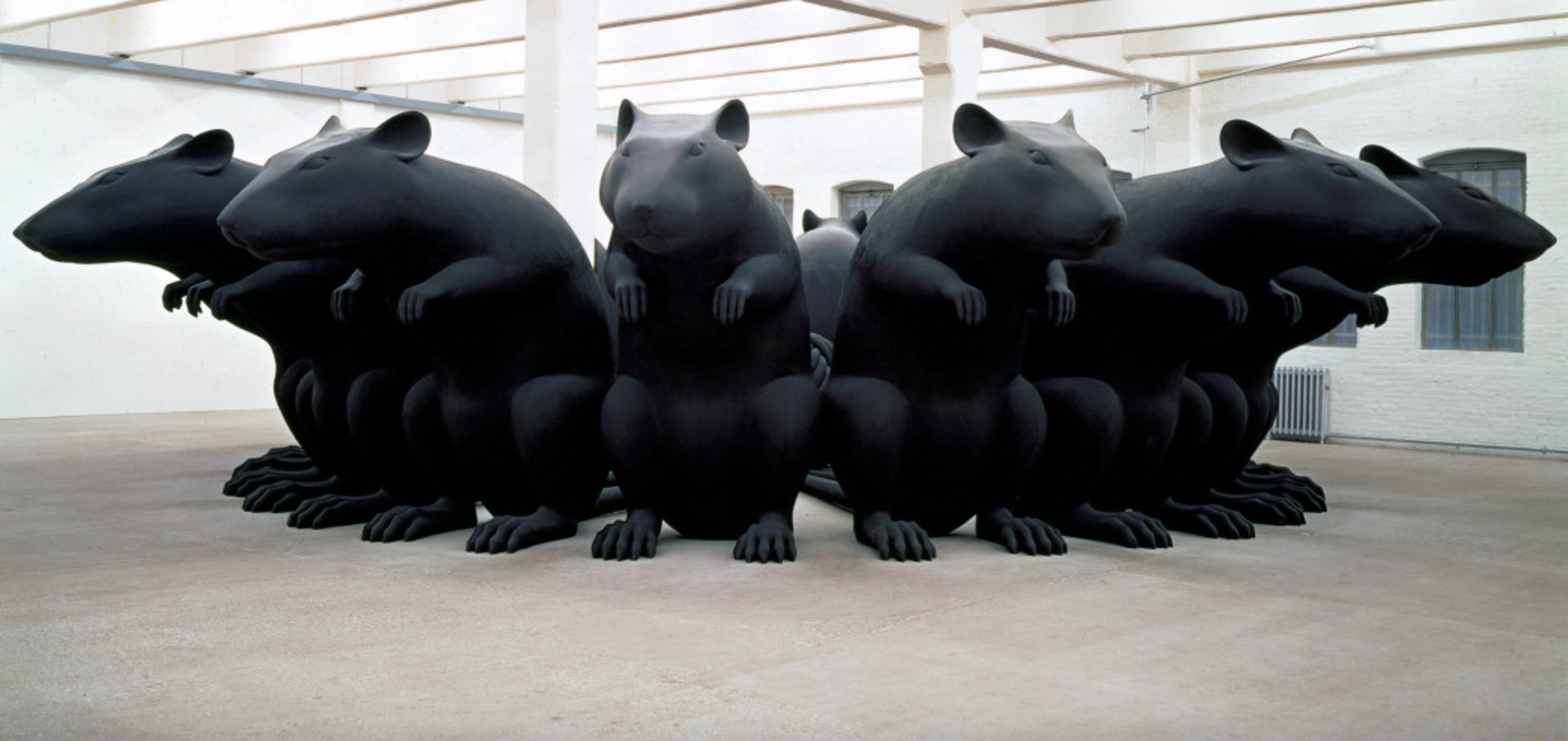 Alemani describes the first time she saw one of Fritsch’s works in person at the 1999 Venice Biennale curated by Harald Szeemann. “The massive piece filling the main room at the Central Pavilion was titled Rattenkönig, the Rat King, a disquieting sculpture in which a group of giant rodents is crouched in a circle with their tails knotted together, like some strange magic ritual.”