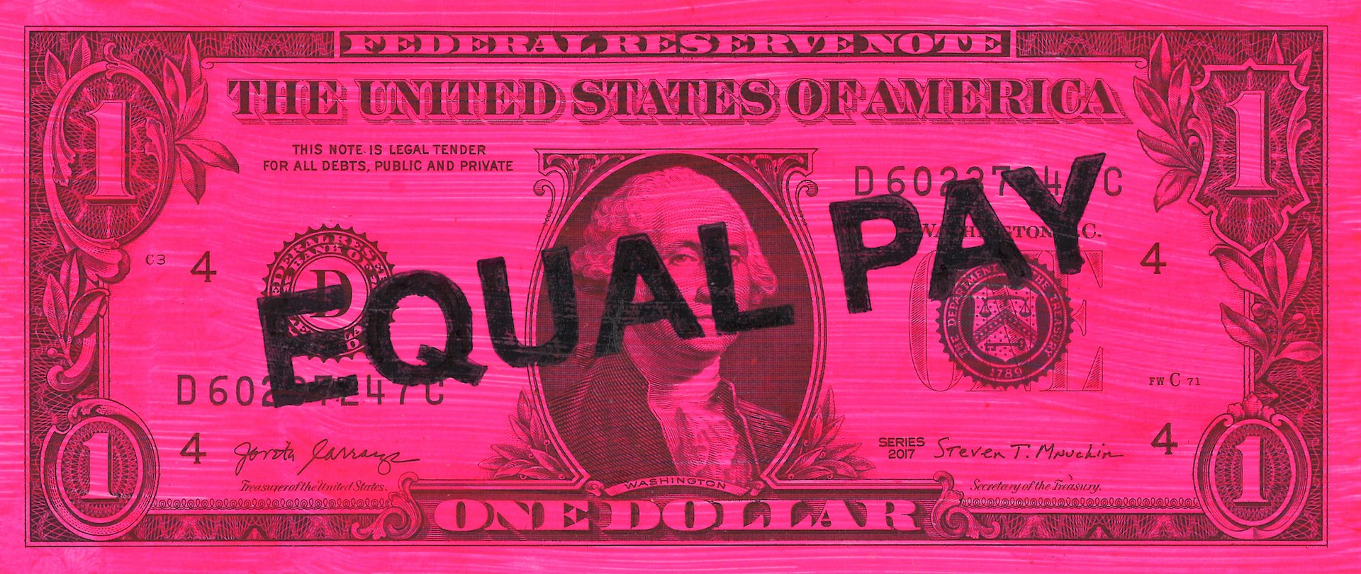 The persistent devaluing of women’s labour is addressed more or less overtly by works in the nationwide exhibition Patriarchy RIP, which was organised by SaveArtSpace, a nonprofit that takes over spaces typically used for advertising to display contemporary art, typically with a social justice theme. Some works, like Michele Pred’s Equal Pay, a bright pink $1 bill overlaid with the titular phrase that will be on view at two locations in Los Angeles, are bold and direct.